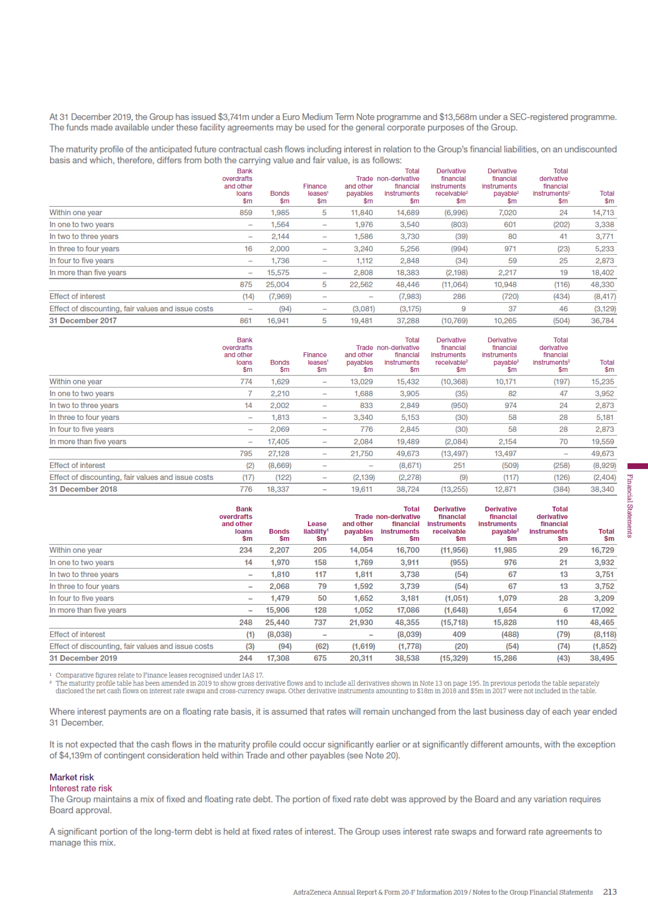 At 31 December 2019, the Group has issued $3,741m under a Euro Medium Term Note programme and $13,568m under a SEC-registered programme. The funds made available under these facility agreements may be used for the general corporate purposes of the Group. The maturity profile of the anticipated future contractual cash flows including interest in relation to the Group’s financial liabilities, on an undiscounted basis and which, therefore, differs from both the carrying value and fair value, is as follows: Bank overdrafts and other loans $m Total Trade non-derivative Derivative financial instruments receivable2 $m Derivative financial instruments payable2 $m Total derivative financial instruments2 $m Finance leases1 $m and other payables financial instruments $m Bonds $m Total $m $m Within one year 859 1,985 5 11,840 14,689 (6,996) 7,020 24 14,713 In one to two years – 1,564 – 1,976 3,540 (803) 601 (202) 3,338 In two to three years – 2,144 – 1,586 3,730 (39) 80 41 3,771 In three to four years 16 2,000 – 3,240 5,256 (994) 971 (23) 5,233 In four to five years – 1,736 – 1,112 2,848 (34) 59 25 2,873 In more than five years – 15,575 – 2,808 18,383 (2,198) 2,217 19 18,402 875 25,004 5 22,562 48,446 (11,064) 10,948 (116) 48,330 Effect of interest (14) (7,969) – – (7,983) 286 (720) (434) (8,417) Effect of discounting, fair values and issue costs – (94) – (3,081) (3,175) 9 37 46 (3,129) 31 December 2017 861 16,941 5 19,481 37,288 (10,769) 10,265 (504) 36,784 Bank overdrafts and other loans $m Total Trade non-derivative Derivative financial instruments receivable2 $m Derivative financial instruments payable2 $m Total derivative financial instruments2 $m Finance leases1 $m and other payables financial instruments $m Bonds $m Total $m $m Within one year 774 1,629 – 13,029 15,432 (10,368) 10,171 (197) 15,235 In one to two years 7 2,210 – 1,688 3,905 (35) 82 47 3,952 In two to three years 14 2,002 – 833 2,849 (950) 974 24 2,873 In three to four years – 1,813 – 3,340 5,153 (30) 58 28 5,181 In four to five years – 2,069 – 776 2,845 (30) 58 28 2,873 In more than five years – 17,405 – 2,084 19,489 (2,084) 2,154 70 19,559 795 27,128 – 21,750 49,673 (13,497) 13,497 – 49,673 Effect of interest (2) (8,669) – – (8,671) 251 (509) (258) (8,929) Effect of discounting, fair values and issue costs (17) (122) – (2,139) (2,278) (9) (117) (126) (2,404) 31 December 2018 776 18,337 – 19,611 38,724 (13,255) 12,871 (384) 38,340 Bank overdrafts and other loans $m Total Trade non-derivative Derivative financial instruments receivable $m Derivative financial instruments payable2 $m Total derivative financial instruments $m Lease liability1 $m and other financial instruments $m Bonds $m payables $m Total $m Within one year 234 2,207 205 14,054 16,700 (11,956) 11,985 29 16,729 In one to two years 14 1,970 158 1,769 3,911 (955) 976 21 3,932 In two to three years – 1,810 117 1,811 3,738 (54) 67 13 3,751 In three to four years – 2,068 79 1,592 3,739 (54) 67 13 3,752 In four to five years – 1,479 50 1,652 3,181 (1,051) 1,079 28 3,209 In more than five years – 15,906 128 1,052 17,086 (1,648) 1,654 6 17,092 248 25,440 737 21,930 48,355 (15,718) 15,828 110 48,465 Effect of interest (1) (8,038) – – (8,039) 409 (488) (79) (8,118) Effect of discounting, fair values and issue costs (3) (94) (62) (1,619) (1,778) (20) (54) (74) (1,852) 31 December 2019 244 17,308 675 20,311 38,538 (15,329) 15,286 (43) 38,495 1 Comparative figures relate to Finance leases recognised under IAS 17. 2 The maturity profile table has been amended in 2019 to show gross derivative flows and to include all derivatives shown in Note 13 on page 195. In previous periods the table separately disclosed the net cash flows on interest rate swaps and cross-currency swaps. Other derivative instruments amounting to $18m in 2018 and $5m in 2017 were not included in the table. Where interest payments are on a floating rate basis, it is assumed that rates will remain unchanged from the last business day of each year ended 31 December. It is not expected that the cash flows in the maturity profile could occur significantly earlier or at significantly different amounts, with the exception of $4,139m of contingent consideration held within Trade and other payables (see Note 20). Market risk Interest rate risk The Group maintains a mix of fixed and floating rate debt. The portion of fixed rate debt was approved by the Board and any variation requires Board approval. A significant portion of the long-term debt is held at fixed rates of interest. The Group uses interest rate swaps and forward rate agreements to manage this mix. AstraZeneca Annual Report & Form 20-F Information 2019 / Notes to the Group Financial Statements 213 Financial Statements