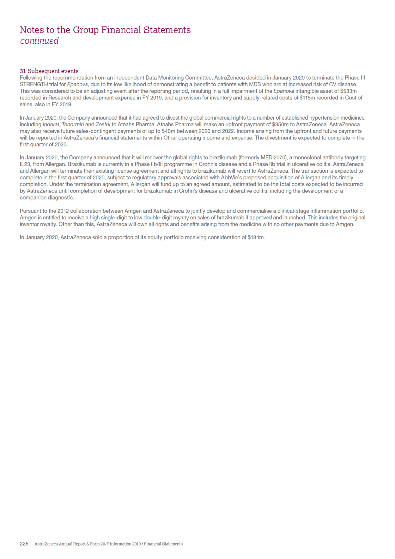 Notes to the Group Financial Statements continued 31 Subsequent events Following the recommendation from an independent Data Monitoring Committee, AstraZeneca decided in January 2020 to terminate the Phase III STRENGTH trial for Epanova, due to its low likelihood of demonstrating a benefit to patients with MDS who are at increased risk of CV disease. This was considered to be an adjusting event after the reporting period, resulting in a full impairment of the Epanova intangible asset of $533m recorded in Research and development expense in FY 2019, and a provision for inventory and supply-related costs of $115m recorded in Cost of sales, also in FY 2019. In January 2020, the Company announced that it had agreed to divest the global commercial rights to a number of established hypertension medicines, including Inderal, Tenormin and Zestril to Atnahs Pharma. Atnahs Pharma will make an upfront payment of $350m to AstraZeneca. AstraZeneca may also receive future sales-contingent payments of up to $40m between 2020 and 2022. Income arising from the upfront and future payments will be reported in AstraZeneca’s financial statements within Other operating income and expense. The divestment is expected to complete in the first quarter of 2020. In January 2020, the Company announced that it will recover the global rights to brazikumab (formerly MEDI2070), a monoclonal antibody targeting IL23, from Allergan. Brazikumab is currently in a Phase IIb/III programme in Crohn’s disease and a Phase IIb trial in ulcerative colitis. AstraZeneca and Allergan will terminate their existing license agreement and all rights to brazikumab will revert to AstraZeneca. The transaction is expected to complete in the first quarter of 2020, subject to regulatory approvals associated with AbbVie’s proposed acquisition of Allergan and its timely completion. Under the termination agreement, Allergan will fund up to an agreed amount, estimated to be the total costs expected to be incurred by AstraZeneca until completion of development for brazikumab in Crohn’s disease and ulcerative colitis, including the development of a companion diagnostic. Pursuant to the 2012 collaboration between Amgen and AstraZeneca to jointly develop and commercialise a clinical-stage inflammation portfolio, Amgen is entitled to receive a high single-digit to low double-digit royalty on sales of brazikumab if approved and launched. This includes the original inventor royalty. Other than this, AstraZeneca will own all rights and benefits arising from the medicine with no other payments due to Amgen. In January 2020, AstraZeneca sold a proportion of its equity portfolio receiving consideration of $184m. 226 AstraZeneca Annual Report & Form 20-F Information 2019 / Financial Statements
