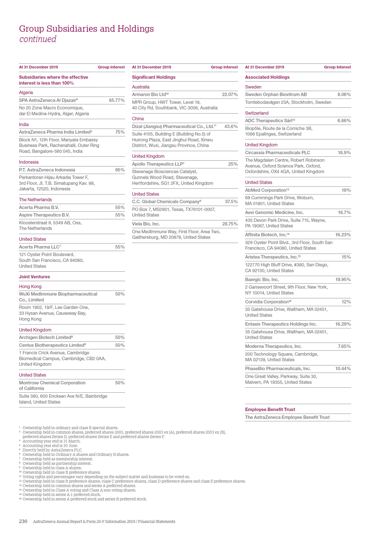 Group Subsidiaries and Holdings continued At 31 December 2019 Group Interest At 31 December 2019 Group Interest At 31 December 2019 Group Interest Subsidiaries where the effective interest is less than 100% Significant Holdings Associated Holdings Australia Sweden A lgeria Armaron Bio Ltd10 22.07% Sweden Orphan Biovitrum AB 8.06% S PA AstraZeneca Al Djazair9 65.77% MPR Group, HWT Tower, Level 19, 40 City Rd, Southbank, VIC 3006, Australia Tomtebodavägen 23A, Stockholm, Sweden No 20 Zone Macro Economique, dar El Medina-Hydra, Alger, Algeria Switzerland China ADC Therapeutics Sàrl12 6.66% I ndia Dizal (Jiangsu) Pharmaceutical Co., Ltd.11 43.6% Biopôle, Route de la Corniche 3B, 1066 Epalinges, Switzerland A straZeneca Pharma India Limited3 75% Suite 4105, Building E (Building No.5) of Huirong Plaza, East Jinghui Road, Xinwu District, Wuxi, Jiangsu Province, China Block N1, 12th Floor, Manyata Embassy Business Park, Rachenahalli, Outer Ring Road, Bangalore-560 045, India United Kingdom Circassia Pharmaceuticals PLC 18.9% United Kingdom The Magdalen Centre, Robert Robinson Avenue, Oxford Science Park, Oxford, Oxfordshire, OX4 4GA, United Kingdom I ndonesia Apollo Therapeutics LLP7 25% P .T. AstraZeneca Indonesia 95% Stevenage Biosciences Catalyst, Gunnels Wood Road, Stevenage, Hertfordshire, SG1 2FX, United Kingdom Perkantoran Hijau Arkadia Tower F, 3rd Floor, JI. T.B. Simatupang Kav. 88, Jakarta, 12520, Indonesia United States AbMed Corporation13 18% United States 68 Cummings Park Drive, Woburn, MA 01801, United States T he Netherlands C.C. Global Chemicals Company8 37.5% A certa Pharma B.V. 55% PO Box 7, MS2901, Texas, TX76101-0007, United States Aevi Genomic Medicine, Inc. 16.7% Aspire Therapeutics B.V. 55% 435 Devon Park Drive, Suite 715, Wayne, PA 19087, United States Kloosterstraat 9, 5349 AB, Oss, Viela Bio, Inc. 28.75% The Netherlands One MedImmune Way, First Floor, Area Two, Gaithersburg, MD 20878, United States Affinita Biotech, Inc.14 16.23% United States 329 Oyster Point Blvd., 3rd Floor, South San Francisco, CA 94080, United States Acerta Pharma LLC7 55% 121 Oyster Point Boulevard, South San Francisco, CA 94080, United States Aristea Therapeutics, Inc.15 15% 122770 High Bluff Drive, #380, San Diego, CA 92130, United States Joint Ventures Baergic Bio, Inc. 19.95% Hong Kong 2 Gansevoort Street, 9th Floor, New York, NY 10014, United States WuXi MedImmune Biopharmaceutical Co., Limited 50% Corvidia Corporation16 12% Room 1902, 19/F, Lee Garden One, 33 Hysan Avenue, Causeway Bay, Hong Kong 35 Gatehouse Drive, Waltham, MA 02451, United States Entasis Therapeutics Holdings Inc. 16.29% United Kingdom 35 Gatehouse Drive, Waltham, MA 02451, United States Archigen Biotech Limited9 50% Centus Biotherapeutics Limited9 50% Moderna Therapeutics, Inc. 7.65% 1 Francis Crick Avenue, Cambridge Biomedical Campus, Cambridge, CB2 0AA, United Kingdom 200 Technology Square, Cambridge, MA 02139, United States PhaseBio Pharmaceuticals, Inc. 10.44% United States One Great Valley, Parkway, Suite 30, Malvern, PA 19355, United States Montrose Chemical Corporation of California 50% Suite 380, 600 Ericksen Ave N/E, Bainbridge Island, United States Employee Benefit Trust The AstraZeneca Employee Benefit Trust 1 Ownership held in ordinary and class B special shares. 2 Ownership held in common shares, preferred shares 2003, preferred shares 2003 ex (A), preferred shares 2003 ex (B), preferred shares Series D, preferred shares Series E and preferred shares Series F. 3 Accounting year end is 31 March. 4 Accounting year end is 30 June. 5 Directly held by AstraZeneca PLC. 6 Ownership held in Ordinary A shares and Ordinary B shares. 7 Ownership held as membership interest. 8 Ownership held as partnership interest. 9 Ownership held in class A shares. 10 Ownership held in class B preference shares. 11 Voting rights and percentages vary depending on the subject matter and business to be voted on. 12 Ownership held in class B preference shares, class C preference shares, class D preference shares and class E preference shares. 13 Ownership held in common shares and series A preferred shares. 14 Ownership held in Class A voting and Class A non-voting shares. 15 Ownership held in series A-1 preferred stock. 16 Ownership held in series A preferred stock and series B preferred stock. 230 AstraZeneca Annual Report & Form 20-F Information 2019 / Financial Statements