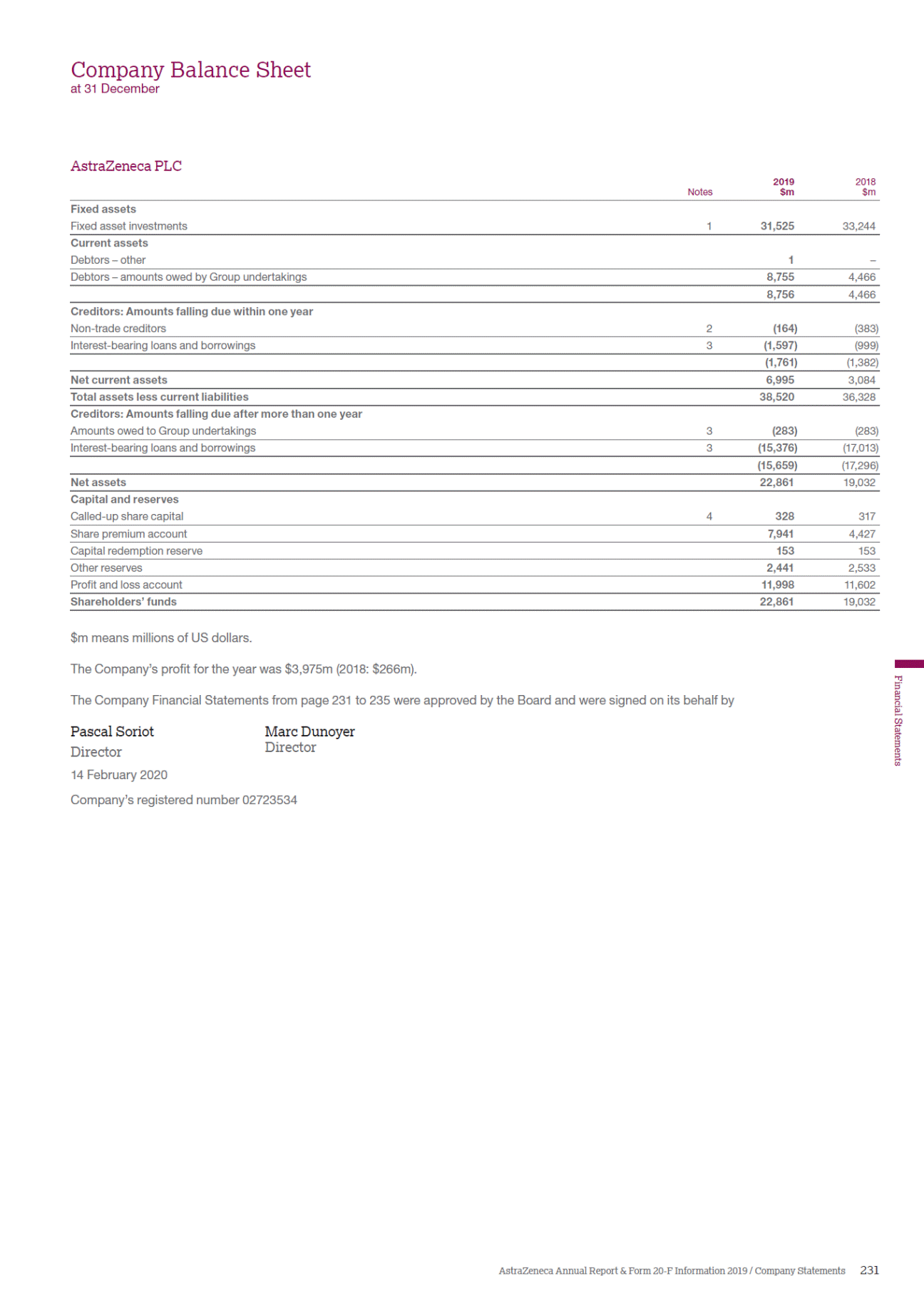 Company Balance Sheet at 31 December AstraZeneca PLC 2019 $m 2018 $m Notes Fixed assets Fixed asset investments 1 31,525 33,244 Current assets Debtors – other 1 – Debtors – amounts owed by Group undertakings 8,755 4,466 8,756 4,466 Creditors: Amounts falling due within one year Non-trade creditors 2 (164) (383) Interest-bearing loans and borrowings 3 (1,597) (999) (1,761) (1,382) Net current assets 6,995 3,084 Total assets less current liabilities 38,520 36,328 Creditors: Amounts falling due after more than one year Amounts owed to Group undertakings 3 (283) (283) Interest-bearing loans and borrowings 3 (15,376) (17,013) (15,659) (17,296) Net assets 22,861 19,032 Capital and reserves Called-up share capital 4 328 317 Share premium account 7,941 4,427 Capital redemption reserve 153 153 Other reserves 2,441 2,533 Profit and loss account 11,998 11,602 Shareholders’ funds 22,861 19,032 $m means millions of US dollars. The Company’s profit for the year was $3,975m (2018: $266m). The Company Financial Statements from page 231 to 235 were approved by the Board and were signed on its behalf by Pascal Soriot Director 14 February 2020 Marc Dunoyer Director Company’s registered number 02723534 231 AstraZeneca Annual Report & Form 20-F Information 2019 / Company Statements Financial Statements