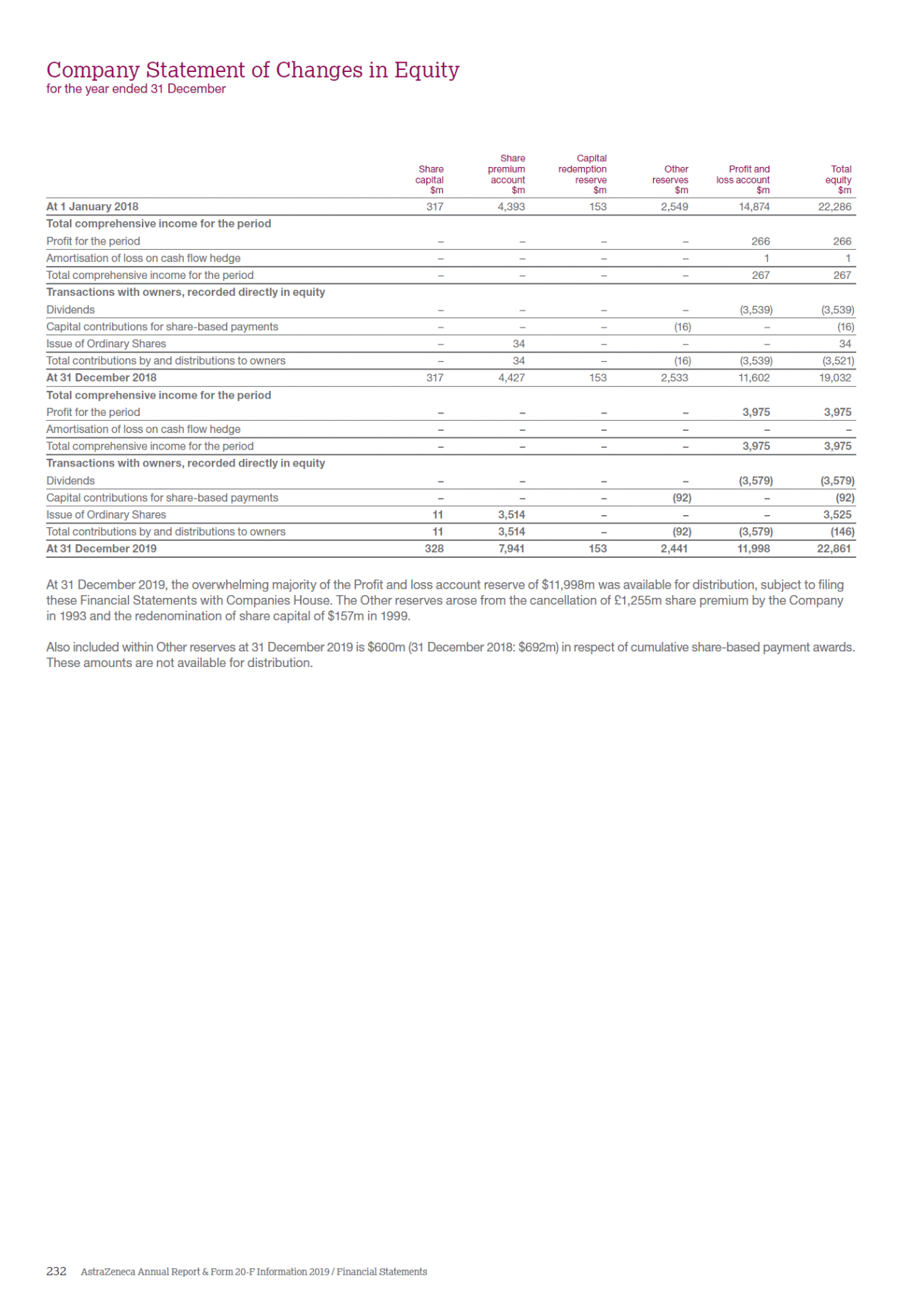 Company Statement of Changes in Equity for the year ended 31 December Share premium account $m Capital redemption reserve $m Share capital $m Other reserves $m Profit and loss account $m Total equity $m At 1 January 2018 317 4,393 153 2,549 14,874 22,286 Total comprehensive income for the period Profit for the period – – – – 266 266 Amortisation of loss on cash flow hedge – – – – 1 1 Total comprehensive income for the period – – – – 267 267 Transactions with owners, recorded directly in equity Dividends – – – – (3,539) (3,539) Capital contributions for share-based payments – – – (16) – (16) Issue of Ordinary Shares – 34 – – – 34 Total contributions by and distributions to owners – 34 – (16) (3,539) (3,521) At 31 December 2018 317 4,427 153 2,533 11,602 19,032 Total comprehensive income for the period Profit for the period – – – – 3,975 3,975 Amortisation of loss on cash flow hedge – – – – – – Total comprehensive income for the period – – – – 3,975 3,975 Transactions with owners, recorded directly in equity Dividends – – – – (3,579) (3,579) Capital contributions for share-based payments – – – (92) – (92) Issue of Ordinary Shares 11 3,514 – – – 3,525 Total contributions by and distributions to owners 11 3,514 – (92) (3,579) (146) At 31 December 2019 328 7,941 153 2,441 11,998 22,861 At 31 December 2019, the overwhelming majority of the Profit and loss account reserve of $11,998m was available for distribution, subject to filing these Financial Statements with Companies House. The Other reserves arose from the cancellation of £1,255m share premium by the Company in 1993 and the redenomination of share capital of $157m in 1999. Also included within Other reserves at 31 December 2019 is $600m (31 December 2018: $692m) in respect of cumulative share-based payment awards. These amounts are not available for distribution. 232 AstraZeneca Annual Report & Form 20-F Information 2019 / Financial Statements