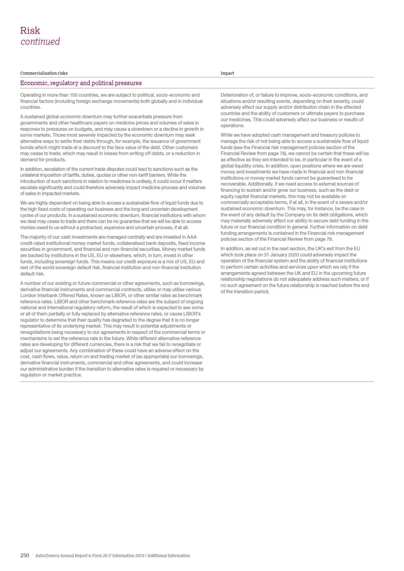 Risk continued Commercialisation risks Impact Economic, regulatory and political pressures Operating in more than 100 countries, we are subject to political, socio-economic and financial factors (including foreign exchange movements) both globally and in individual countries. A sustained global economic downturn may further exacerbate pressure from governments and other healthcare payers on medicine prices and volumes of sales in response to pressures on budgets, and may cause a slowdown or a decline in growth in some markets. Those most severely impacted by the economic downturn may seek alternative ways to settle their debts through, for example, the issuance of government bonds which might trade at a discount to the face value of the debt. Other customers may cease to trade, which may result in losses from writing off debts, or a reduction in demand for products. In addition, escalation of the current trade disputes could lead to sanctions such as the unilateral imposition of tariffs, duties, quotas or other non-tariff barriers. While the introduction of such sanctions in relation to medicines is unlikely, it could occur if matters escalate significantly and could therefore adversely impact medicine process and volumes of sales in impacted markets. We are highly dependent on being able to access a sustainable flow of liquid funds due to the high fixed costs of operating our business and the long and uncertain development cycles of our products. In a sustained economic downturn, financial institutions with whom we deal may cease to trade and there can be no guarantee that we will be able to access monies owed to us without a protracted, expensive and uncertain process, if at all. The majority of our cash investments are managed centrally and are invested in AAA credit-rated institutional money market funds, collateralised bank deposits, fixed income securities in government, and financial and non-financial securities. Money market funds are backed by institutions in the US, EU or elsewhere, which, in turn, invest in other funds, including sovereign funds. This means our credit exposure is a mix of US, EU and rest of the world sovereign default risk, financial institution and non-financial institution default risk. A number of our existing or future commercial or other agreements, such as borrowings, derivative financial instruments and commercial contracts, utilise or may utilise various London Interbank Offered Rates, known as LIBOR, or other similar rates as benchmark reference rates. LIBOR and other benchmark reference rates are the subject of ongoing national and international regulatory reform, the result of which is expected to see some or all of them partially or fully replaced by alternative reference rates, or cause LIBOR’s regulator to determine that their quality has degraded to the degree that it is no longer representative of its underlying market. This may result in potential adjustments or renegotiations being necessary to our agreements in respect of the commercial terms or mechanisms to set the reference rate in the future. While different alternative reference rates are developing for different currencies, there is a risk that we fail to renegotiate or adjust our agreements. Any combination of these could have an adverse effect on the cost, cash flows, value, return on and trading market of (as appropriate) our borrowings, derivative financial instruments, commercial and other agreements, and could increase our administrative burden if the transition to alternative rates is required or necessary by regulation or market practice. Deterioration of, or failure to improve, socio-economic conditions, and situations and/or resulting events, depending on their severity, could adversely affect our supply and/or distribution chain in the affected countries and the ability of customers or ultimate payers to purchase our medicines. This could adversely affect our business or results of operations. While we have adopted cash management and treasury policies to manage the risk of not being able to access a sustainable flow of liquid funds (see the Financial risk management policies section of the Financial Review from page 78), we cannot be certain that these will be as effective as they are intended to be, in particular in the event of a global liquidity crisis. In addition, open positions where we are owed money and investments we have made in financial and non-financial institutions or money market funds cannot be guaranteed to be recoverable. Additionally, if we need access to external sources of financing to sustain and/or grow our business, such as the debt or equity capital financial markets, this may not be available on commercially acceptable terms, if at all, in the event of a severe and/or sustained economic downturn. This may, for instance, be the case in the event of any default by the Company on its debt obligations, which may materially adversely affect our ability to secure debt funding in the future or our financial condition in general. Further information on debt funding arrangements is contained in the Financial risk management policies section of the Financial Review from page 78. In addition, as set out in the next section, the UK’s exit from the EU which took place on 31 January 2020 could adversely impact the operation of the financial system and the ability of financial institutions to perform certain activities and services upon which we rely if the arrangements agreed between the UK and EU in the upcoming future relationship negotiations do not adequately address such matters, or if no such agreement on the future relationship is reached before the end of the transition period. 250 AstraZeneca Annual Report & Form 20-F Information 2019 / Additional Information