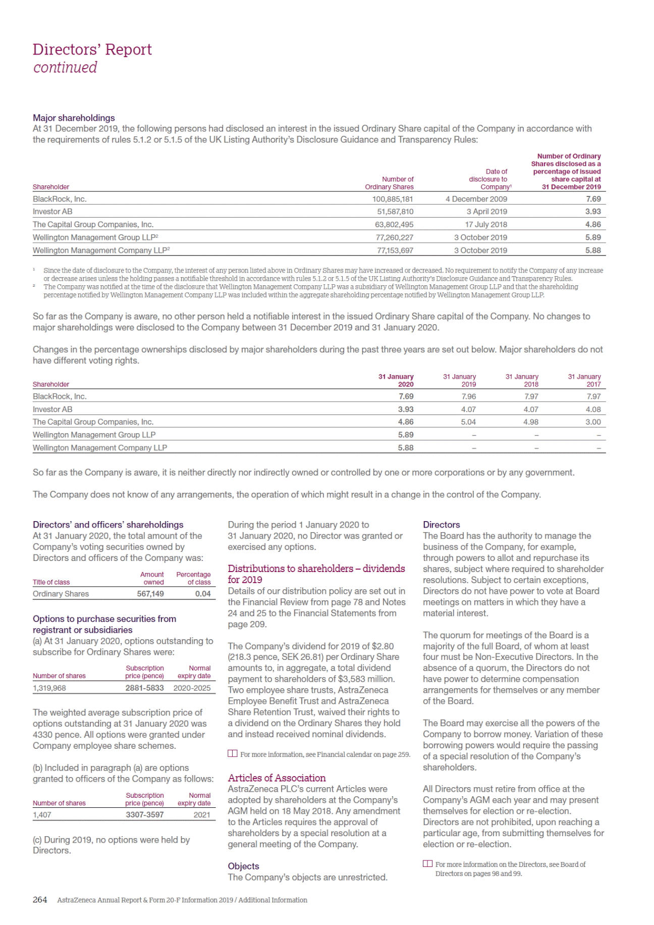 Directors’ Report continued Major shareholdings At 31 December 2019, the following persons had disclosed an interest in the issued Ordinary Share capital of the Company in accordance with the requirements of rules 5.1.2 or 5.1.5 of the UK Listing Authority’s Disclosure Guidance and Transparency Rules: Number of Ordinary Shares disclosed as a Date of disclosure to Company1 percentage of issued share capital at 31 December 2019 Number of Ordinary Shares Shareholder BlackRock, Inc. 100,885,181 4 December 2009 7.69 Investor AB 51,587,810 3 April 2019 3.93 The Capital Group Companies, Inc. 63,802,495 17 July 2018 4.86 Wellington Management Group LLP2 77,260,227 3 October 2019 5.89 Wellington Management Company LLP2 77,153,697 3 October 2019 5.88 1 Since the date of disclosure to the Company, the interest of any person listed above in Ordinary Shares may have increased or decreased. No requirement to notify the Company of any increase or decrease arises unless the holding passes a notifiable threshold in accordance with rules 5.1.2 or 5.1.5 of the UK Listing Authority’s Disclosure Guidance and Transparency Rules. The Company was notified at the time of the disclosure that Wellington Management Company LLP was a subsidiary of Wellington Management Group LLP and that the shareholding percentage notified by Wellington Management Company LLP was included within the aggregate shareholding percentage notified by Wellington Management Group LLP. 2 So far as the Company is aware, no other person held a notifiable interest in the issued Ordinary Share capital of the Company. No changes to major shareholdings were disclosed to the Company between 31 December 2019 and 31 January 2020. Changes in the percentage ownerships disclosed by major shareholders during the past three years are set out below. Major shareholders do not have different voting rights. 31 January 2020 31 January 2019 31 January 2018 31 January 2017 Shareholder BlackRock, Inc. 7.69 7.96 7.97 7.97 Investor AB 3.93 4.07 4.07 4.08 The Capital Group Companies, Inc. 4.86 5.04 4.98 3.00 Wellington Management Group LLP 5.89 – – – Wellington Management Company LLP 5.88 – – – So far as the Company is aware, it is neither directly nor indirectly owned or controlled by one or more corporations or by any government. The Company does not know of any arrangements, the operation of which might result in a change in the control of the Company. Directors’ and officers’ shareholdings At 31 January 2020, the total amount of the Company’s voting securities owned by Directors and officers of the Company was: During the period 1 January 2020 to 31 January 2020, no Director was granted or exercised any options. Directors The Board has the authority to manage the business of the Company, for example, through powers to allot and repurchase its shares, subject where required to shareholder resolutions. Subject to certain exceptions, Directors do not have power to vote at Board meetings on matters in which they have a material interest. Distributions to shareholders – dividends for 2019 Details of our distribution policy are set out in the Financial Review from page 78 and Notes 24 and 25 to the Financial Statements from page 209. Amount owned Percentage of class Title of class Ordinary Shares 567,149 0.04 Options to purchase securities from registrant or subsidiaries (a) At 31 January 2020, options outstanding to subscribe for Ordinary Shares were: The quorum for meetings of the Board is a majority of the full Board, of whom at least four must be Non-Executive Directors. In the absence of a quorum, the Directors do not have power to determine compensation arrangements for themselves or any member of the Board. The Company’s dividend for 2019 of $2.80 (218.3 pence, SEK 26.81) per Ordinary Share amounts to, in aggregate, a total dividend payment to shareholders of $3,583 million. Two employee share trusts, AstraZeneca Employee Benefit Trust and AstraZeneca Share Retention Trust, waived their rights to a dividend on the Ordinary Shares they hold and instead received nominal dividends. Subscription price (pence) Normal expiry date Number of shares 1,319,968 2881-5833 2020-2025 The weighted average subscription price of options outstanding at 31 January 2020 was 4330 pence. All options were granted under Company employee share schemes. The Board may exercise all the powers of the Company to borrow money. Variation of these borrowing powers would require the passing of a special resolution of the Company’s shareholders. For more information, see Financial calendar on page 259. (b) Included in paragraph (a) are options granted to officers of the Company as follows: Articles of Association AstraZeneca PLC’s current Articles were adopted by shareholders at the Company’s AGM held on 18 May 2018. Any amendment to the Articles requires the approval of shareholders by a special resolution at a general meeting of the Company. All Directors must retire from office at the Company’s AGM each year and may present themselves for election or re-election. Directors are not prohibited, upon reaching a particular age, from submitting themselves for election or re-election. Subscription price (pence) Normal expiry date Number of shares 1,407 3307-3597 2021 (c) During 2019, no options were held by Directors. Objects The Company’s objects are unrestricted. For more information on the Directors, see Board of Directors on pages 98 and 99. 264 AstraZeneca Annual Report & Form 20-F Information 2019 / Additional Information