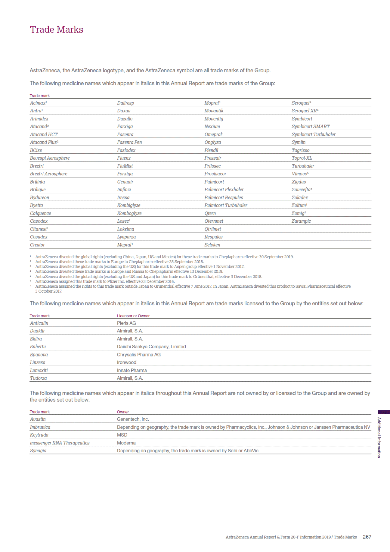 Trade Marks AstraZeneca, the AstraZeneca logotype, and the AstraZeneca symbol are all trade marks of the Group. The following medicine names which appear in italics in this Annual Report are trade marks of the Group: Trade mark Acimax1 Daliresp Mopral 1 Seroquel 4 Antra1 Daxas Movantik Seroquel XR 4 Arimidex Duzallo Moventig Symbicort Atacand 2 Farxiga Nexium Symbicort SMART Atacand HCT Fasenra Omepral 1 Symbicort Turbuhaler Atacand Plus 2 Fasenra Pen Onglyza Symlin BCise Faslodex Plendil Tagrisso Bevespi Aerosphere Fluenz Pressair Toprol-XL Breztri FluMist Prilosec Turbuhaler Breztri Aerosphere Forxiga Provisacor Vimovo5 Brilinta Genuair Pulmicort Xigduo Brilique Imfinzi Pulmicort Flexhaler Zavicefta 6 Bydureon Iressa Pulmicort Respules Zoladex Byetta Kombiglyze Pulmicort Turbuhaler Zoltum1 Calquence Komboglyze Qtern Zomig 7 Casodex Losec1 Qternmet Zurampic Citanest3 Lokelma Qtrilmet Cosudex Lynparza Respules Crestor Mepral 1 Seloken 1 2 3 4 5 6 7 AstraZeneca divested the global rights (excluding China, Japan, US and Mexico) for these trade marks to Cheplapharm effective 30 September 2019. AstraZeneca divested these trade marks in Europe to Cheplapharm effective 28 September 2018. AstraZeneca divested the global rights (excluding the US) for this trade mark to Aspen group effective 1 November 2017. AstraZeneca divested these trade marks in Europe and Russia to Cheplapharm effective 13 December 2019. AstraZeneca divested the global rights (excluding the US and Japan) for this trade mark to Grünenthal, effective 3 December 2018. AstraZeneca assigned this trade mark to Pfizer Inc. effective 23 December 2016. AstraZeneca assigned the rights to this trade mark outside Japan to Grünenthal effective 7 June 2017. In Japan, AstraZeneca divested this product to Sawai Pharmaceutical effective 3 October 2017. The following medicine names which appear in italics in this Annual Report are trade marks licensed to the Group by the entities set out below: Trade mark Licensor or Owner Anticalin Pieris AG Duaklir Almirall, S.A. Eklira Almirall, S.A. Enhertu Daiichi Sankyo Company, Limited Epanova Chrysalis Pharma AG Linzess Ironwood Lumoxiti Innate Pharma Tudorza Almirall, S.A. The following medicine names which appear in italics throughout this Annual Report are not owned by or licensed to the Group and are owned by the entities set out below: Trade mark Owner Avastin Genentech, Inc. Imbruvica Depending on geography, the trade mark is owned by Pharmacyclics, Inc., Johnson & Johnson or Janssen Pharmaceutica NV Keytruda MSD messenger RNA Therapeutics Moderna Synagis Depending on geography, the trade mark is owned by Sobi or AbbVie AstraZeneca Annual Report & Form 20-F Information 2019 / Trade Marks 267 Additional Information