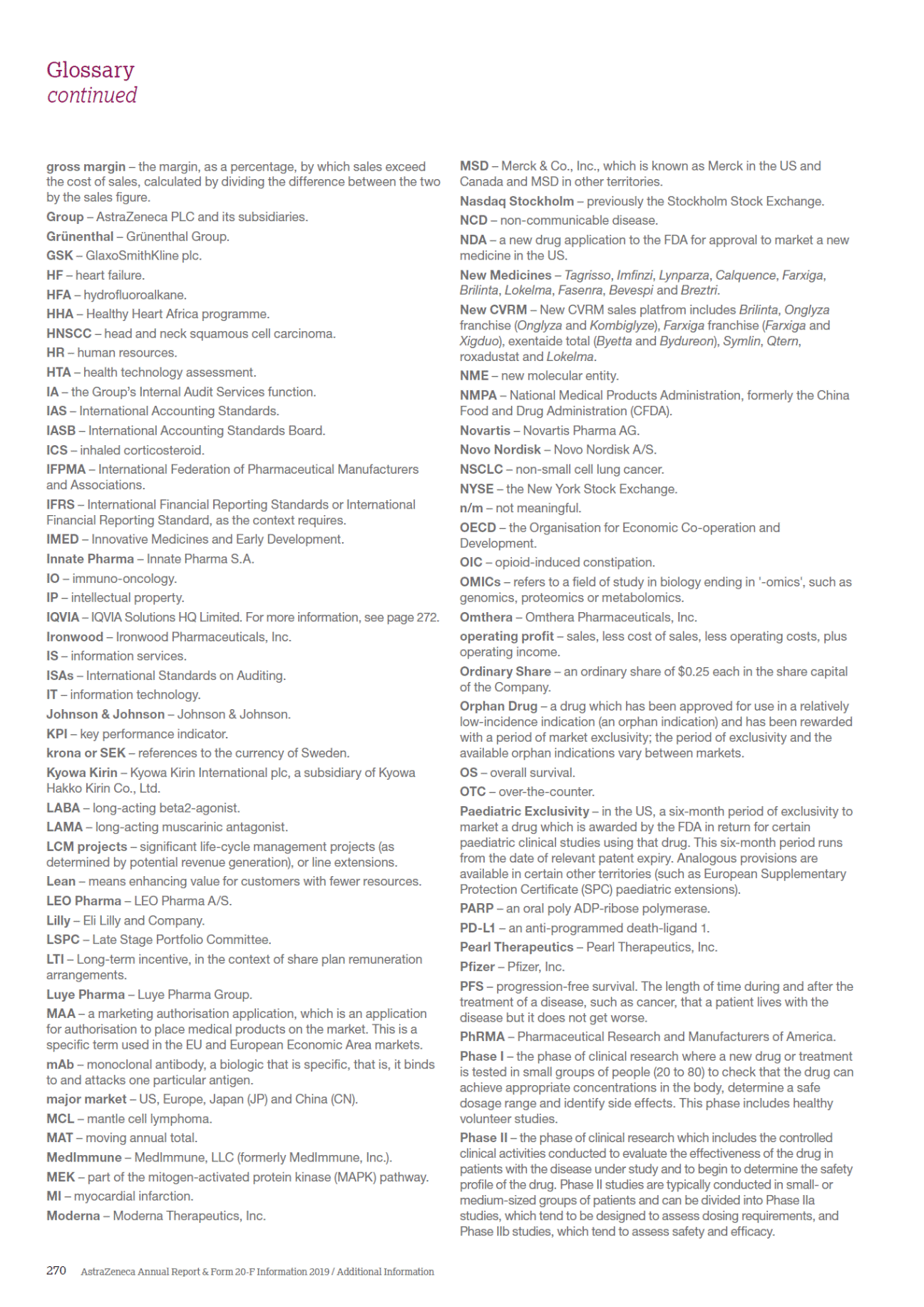Glossary continued gross margin – the margin, as a percentage, by which sales exceed the cost of sales, calculated by dividing the difference between the two by the sales figure. Group – AstraZeneca PLC and its subsidiaries. Grünenthal – Grünenthal Group. GSK – GlaxoSmithKline plc. HF – heart failure. HFA – hydrofluoroalkane. HHA – Healthy Heart Africa programme. HNSCC – head and neck squamous cell carcinoma. HR – human resources. HTA – health technology assessment. IA – the Group’s Internal Audit Services function. IAS – International Accounting Standards. IASB – International Accounting Standards Board. ICS – inhaled corticosteroid. IFPMA – International Federation of Pharmaceutical Manufacturers and Associations. IFRS – International Financial Reporting Standards or International Financial Reporting Standard, as the context requires. IMED – Innovative Medicines and Early Development. Innate Pharma – Innate Pharma S.A. IO – immuno-oncology. IP – intellectual property. IQVIA – IQVIA Solutions HQ Limited. For more information, see page 272. Ironwood – Ironwood Pharmaceuticals, Inc. IS – information services. ISAs – International Standards on Auditing. IT – information technology. Johnson & Johnson – Johnson & Johnson. KPI – key performance indicator. krona or SEK – references to the currency of Sweden. Kyowa Kirin – Kyowa Kirin International plc, a subsidiary of Kyowa Hakko Kirin Co., Ltd. LABA – long-acting beta2-agonist. LAMA – long-acting muscarinic antagonist. LCM projects – significant life-cycle management projects (as determined by potential revenue generation), or line extensions. Lean – means enhancing value for customers with fewer resources. LEO Pharma – LEO Pharma A/S. Lilly – Eli Lilly and Company. LSPC – Late Stage Portfolio Committee. LTI – Long-term incentive, in the context of share plan remuneration arrangements. Luye Pharma – Luye Pharma Group. MAA – a marketing authorisation application, which is an application for authorisation to place medical products on the market. This is a specific term used in the EU and European Economic Area markets. mAb – monoclonal antibody, a biologic that is specific, that is, it binds to and attacks one particular antigen. major market – US, Europe, Japan (JP) and China (CN). MCL – mantle cell lymphoma. MAT – moving annual total. MedImmune – MedImmune, LLC (formerly MedImmune, Inc.). MEK – part of the mitogen-activated protein kinase (MAPK) pathway. MI – myocardial infarction. Moderna – Moderna Therapeutics, Inc. MSD – Merck & Co., Inc., which is known as Merck in the US and Canada and MSD in other territories. Nasdaq Stockholm – previously the Stockholm Stock Exchange. NCD – non-communicable disease. NDA – a new drug application to the FDA for approval to market a new medicine in the US. New Medicines – Tagrisso, Imfinzi, Lynparza, Calquence, Farxiga, Brilinta, Lokelma, Fasenra, Bevespi and Breztri. New CVRM – New CVRM sales platfrom includes Brilinta, Onglyza franchise (Onglyza and Kombiglyze), Farxiga franchise (Farxiga and Xigduo), exentaide total (Byetta and Bydureon), Symlin, Qtern, roxadustat and Lokelma. NME – new molecular entity. NMPA – National Medical Products Administration, formerly the China Food and Drug Administration (CFDA). Novartis – Novartis Pharma AG. Novo Nordisk – Novo Nordisk A/S. NSCLC – non-small cell lung cancer. NYSE – the New York Stock Exchange. n/m – not meaningful. OECD – the Organisation for Economic Co-operation and Development. OIC – opioid-induced constipation. OMICs – refers to a field of study in biology ending in '-omics', such as genomics, proteomics or metabolomics. Omthera – Omthera Pharmaceuticals, Inc. operating profit – sales, less cost of sales, less operating costs, plus operating income. Ordinary Share – an ordinary share of $0.25 each in the share capital of the Company. Orphan Drug – a drug which has been approved for use in a relatively low-incidence indication (an orphan indication) and has been rewarded with a period of market exclusivity; the period of exclusivity and the available orphan indications vary between markets. OS – overall survival. OTC – over-the-counter. Paediatric Exclusivity – in the US, a six-month period of exclusivity to market a drug which is awarded by the FDA in return for certain paediatric clinical studies using that drug. This six-month period runs from the date of relevant patent expiry. Analogous provisions are available in certain other territories (such as European Supplementary Protection Certificate (SPC) paediatric extensions). PARP – an oral poly ADP-ribose polymerase. PD-L1 – an anti-programmed death-ligand 1. Pearl Therapeutics – Pearl Therapeutics, Inc. Pfizer – Pfizer, Inc. PFS – progression-free survival. The length of time during and after the treatment of a disease, such as cancer, that a patient lives with the disease but it does not get worse. PhRMA – Pharmaceutical Research and Manufacturers of America. Phase I – the phase of clinical research where a new drug or treatment is tested in small groups of people (20 to 80) to check that the drug can achieve appropriate concentrations in the body, determine a safe dosage range and identify side effects. This phase includes healthy volunteer studies. Phase II – the phase of clinical research which includes the controlled clinical activities conducted to evaluate the effectiveness of the drug in patients with the disease under study and to begin to determine the safety profile of the drug. Phase II studies are typically conducted in small-or medium-sized groups of patients and can be divided into Phase IIa studies, which tend to be designed to assess dosing requirements, and Phase IIb studies, which tend to assess safety and efficacy. 270 AstraZeneca Annual Report & Form 20-F Information 2019 / Additional Information