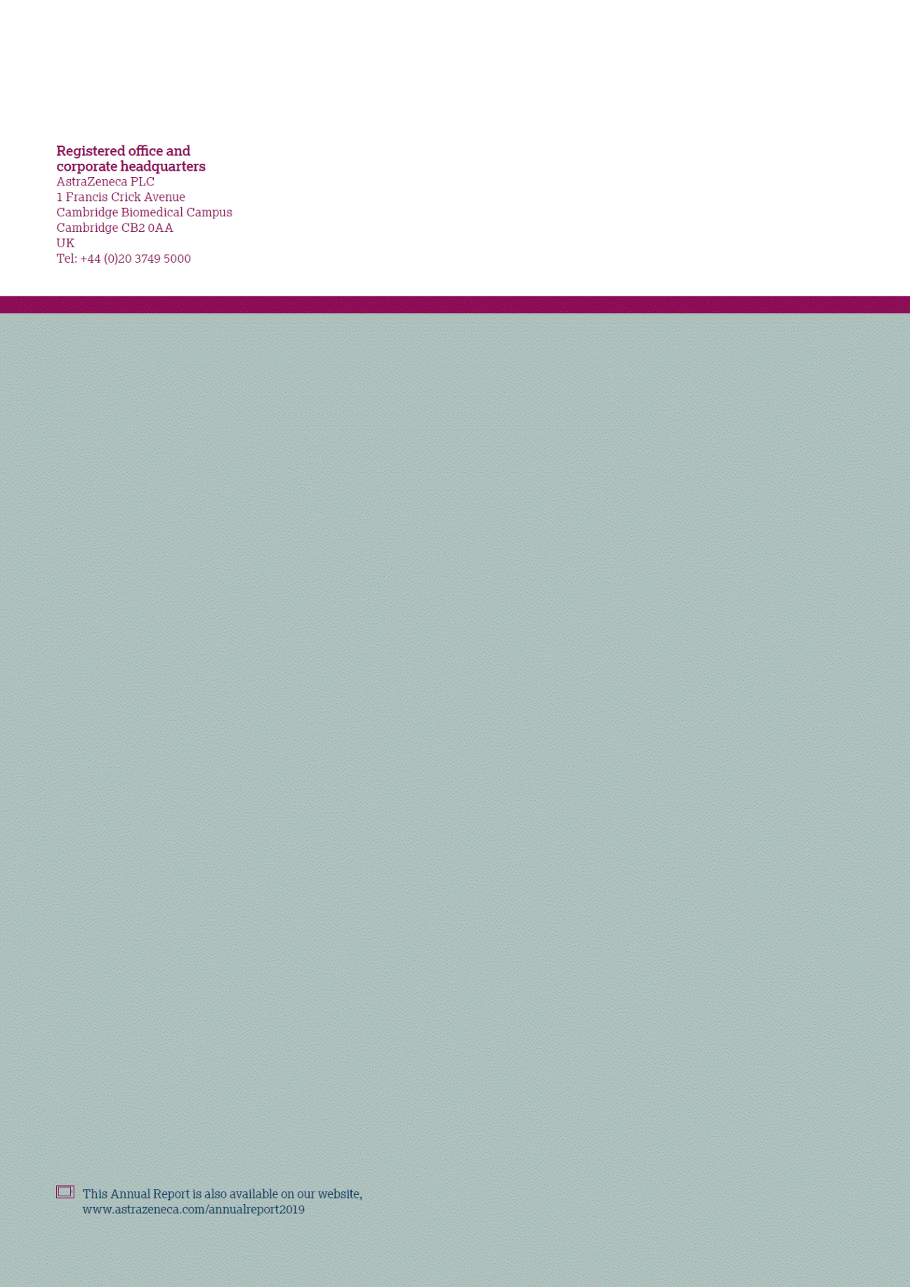Registered office and corporate headquarters AstraZeneca PLC 1 Francis Crick Avenue Cambridge Biomedical Campus Cambridge CB2 0AA UK Tel: +44 (0)20 3749 5000 This Annual Report is also available on our website, www.astrazeneca.com/annualreport2019 A AstraZeneca Annual Report & Form 20-F Information 2018 / Additional Information