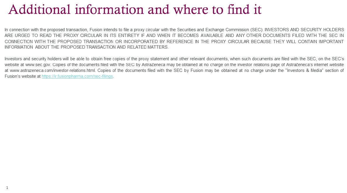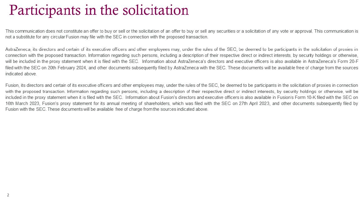 This document may include statements that are not statements of historical fact, or “forward-looking statements,” including with respect to the proposed acquisition of Fusion by AstraZeneca. Such forward looking statements include, but are not limited to, the ability of AstraZeneca and Fusion to complete the transactions contemplated by the arrangement agreement, including the parties’ ability to satisfy the conditions set forth in the arrangement agreement, statements about the expected timetable for completing the transaction, AstraZeneca’s and Fusion’s beliefs and expectations and statements about the benefits sought to be achieved in AstraZeneca’s proposed acquisition of Fusion, the potential effects of the acquisition on both AstraZeneca and Fusion, the possibility of any termination of the arrangement agreement, as well as the expected benefits and success of FPI 2265, and other pipeline product or any combination product. These statements are based upon the current beliefs and expectations of AstraZeneca’s and Fusion’s management and are subject to significant risks and uncertainties. There can be no guarantees that the conditions to the closing of the proposed transaction will be satisfied on the expected timetable or at all or that FPI-2265 will receive the necessary regulatory approvals or prove to be commercially successful if approved. If underlying assumptions prove inaccurate or risks or uncertainties materialise, actual results may differ materially from those set forth in the forward-looking statements.