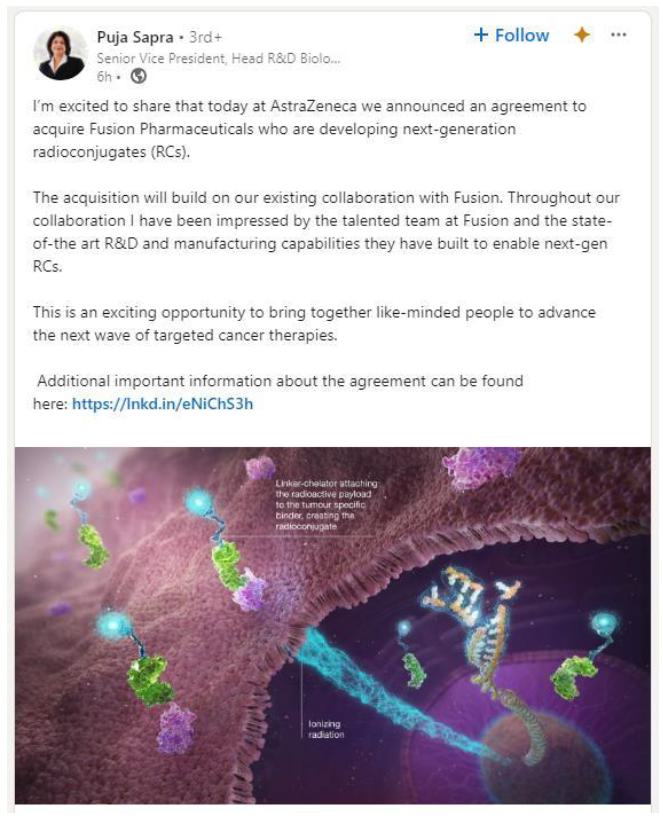 Thrilled to share that @AstraZeneca has announced an agreement to acquire Fusion Pharmaceuticals Inc., a clinical-stage biopharmaceutical company developing next-generation radioconjugates (RCs).