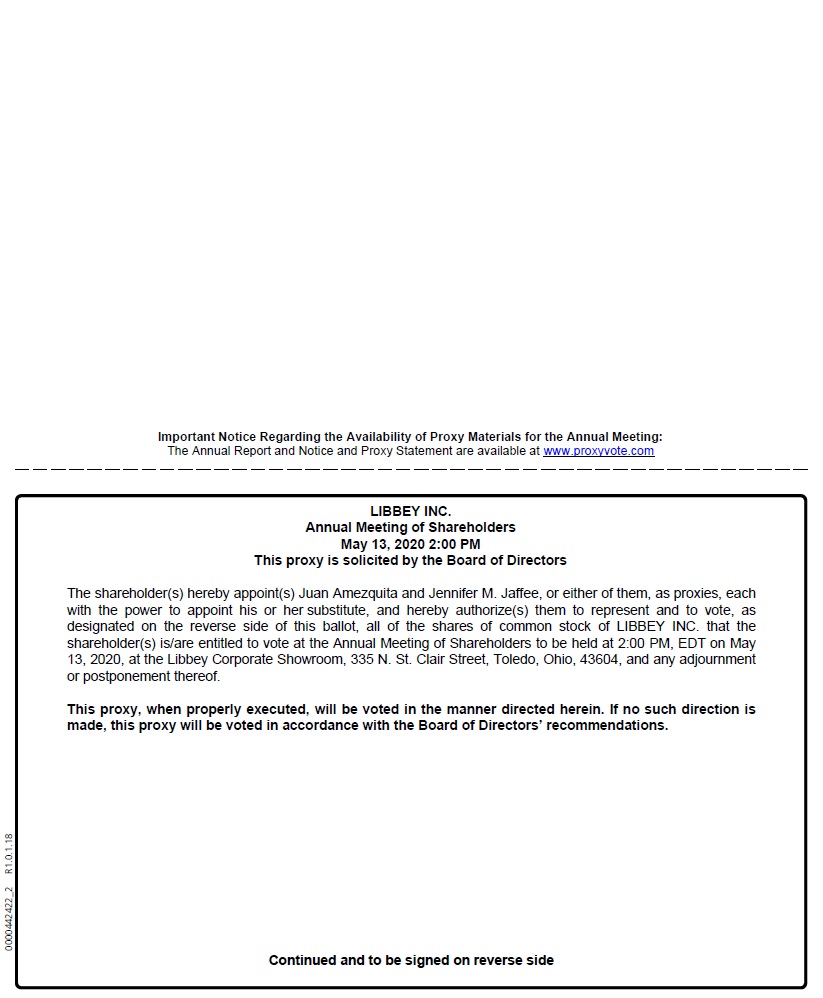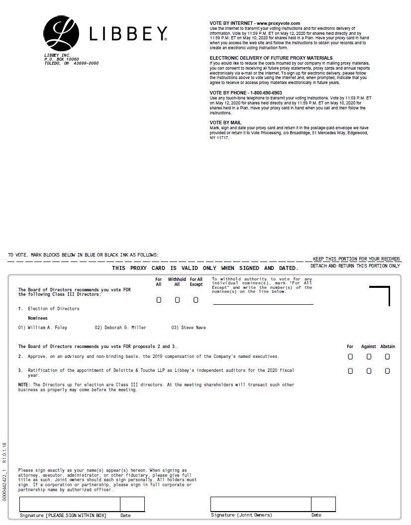 If you participate in one of our 401(k) plans, and if you have investments in the Libbey Inc. stock fund and have an e-mail address provided by Libbey for business purposes, you will receive an e-mail message at your Libbey-provided e-mail address containing instructions that you must follow in order for shares in your account to be voted. If you participate in one of our 401(k) plans, have investments in the Libbey Inc. stock fund and do not have an e-mail address provided by Libbey for business purposes, you will receive instructions from the trustee of the applicable 401(k) plan that you must follow in order for shares in your account to be voted.