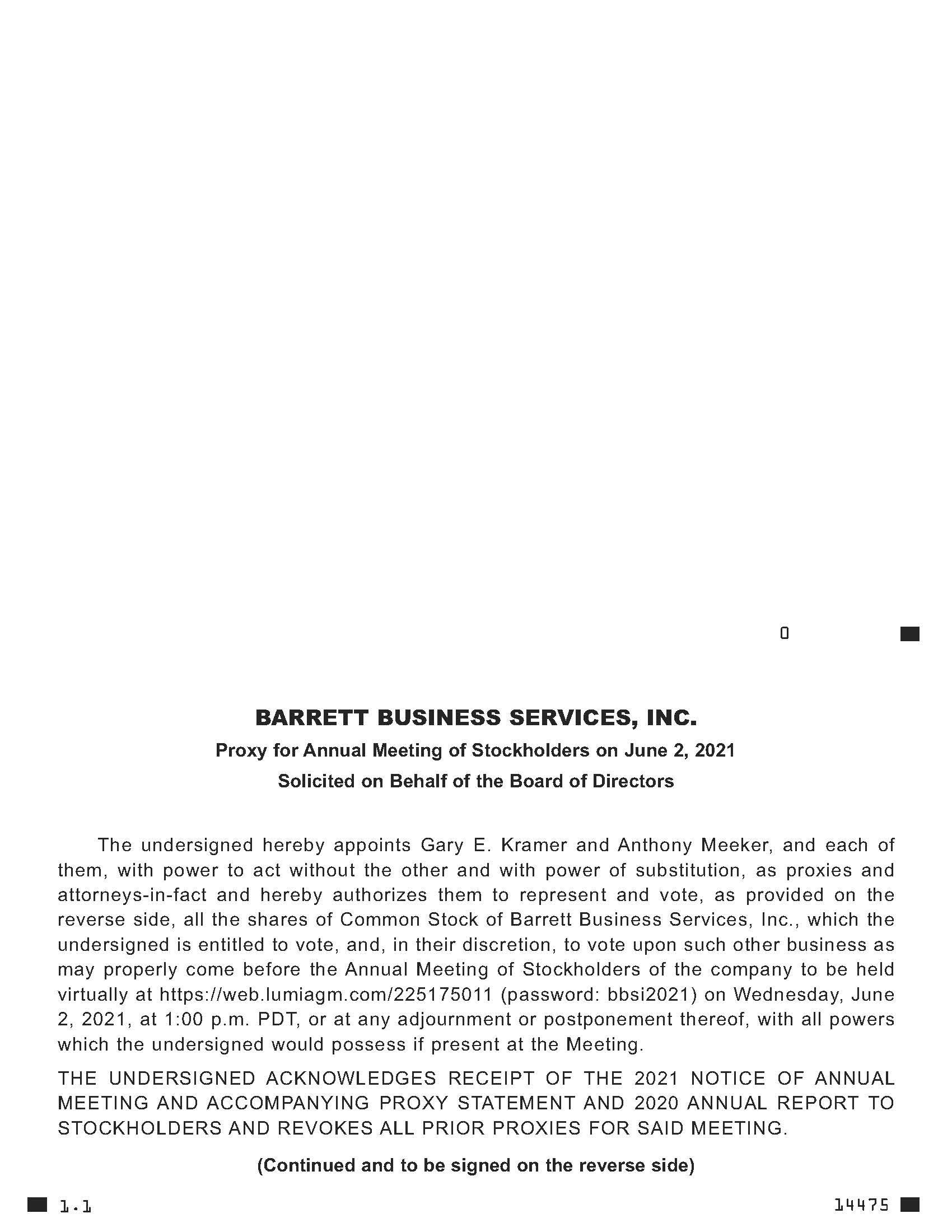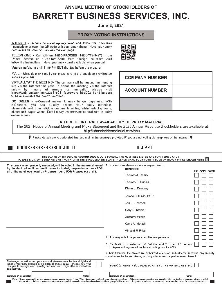 ANNUAL MEETING OF STOCKHOLDERS OF BARRETT BUSINESS SERVICES, INC. June 2, 2021 PROXYVOTINGINSTRUCTIONSINTERNET -Access “www.voteproxy.com” and follow the on-screen instructions or scan the QR code with your smartphone. Have your proxy card available when you access the web page. TELEPHONE -Call toll-free 1-800-PROXIES (1-800-776-9437) in the United States or 1-718-921-8500 from foreign countries and follow the instructions. Have your proxy card available when you call. Vote online/phone until 11:59 PM EDT the day before the meeting. MAIL -Sign, date and mail your proxy card in the envelope provided as soon as possible. VIRTUALLYAT THE MEETING -The company will be hosting the meeting live via the Internet this year. To attend the meeting via the Internet solely by means of remote communication please visit https://web.lumiagm.com/225175011 (password: bbsi2021) and be sure to have available the control number. GO GREEN -e-Consent makes it easy to go paperless. With e-Consent, you can quickly access your proxy materials, statements and other eligible documents online, while reducing costs, clutter and paper waste. Enroll today via www.astfinancial.com to enjoy online access. COMPANY NUMBER ACCOUNT NUMBER NOTICE OF INTERNET AVAILABILITY OF PROXY MATERIAL: The 2021 Notice of Annual Meeting and Proxy Statement and the 2020 Annual Report to Stockholders are available at http://shareholdermaterial.com/bbsi Please detach along perforated line and mail in the envelope provided IF you are not voting via telephone or the Internet. 00003333333333300100 0 060221 THEBOARDOFDIRECTORSRECOMMENDSAVOTEFORALLTHENOMINEESLISTEDANDFORITEMS2AND3.PLEASESIGN,DATEANDRETURNPROMPTLYINTHEENCLOSEDENVELOPE.PLEASEMARKYOURVOTEINBLUEORBLACKINKASSHOWNHEREx This proxy, when properly executed, will be voted in the manner directedby the stockholder. If no directions are indicated, the proxies will vote FORall of the nominees listed on Proposal 1, and FOR Proposals 2 and 3. 1. To elect nine directors to a one-year term. NOMINEES: Thomas J. Carley FOR AGAINST ABSTAIN Thomas B. Cusick Diane L. Dewbrey James B. Hicks, Ph.D. Jon L. Justesen Gary E. Kramer Anthony Meeker Carla A. Moradi Vincent P. Price 2. Advisory vote to approve executive compensation. 3. Ratification of selection of Deloitte and Touche LLP as our independent registered public accounting firm for 2021. In their discretion, the Proxies are authorized to vote on such other business as may properly come before theAnnual Meeting and any adjournment or postponement thereof. To change the address on your account, please check the box at right andindicate your new address in the address space above. Please note that changestotheregisteredname(s)ontheaccountmaynotbesubmittedviaMARK “X” HERE IF YOU PLAN TO ATTEND THE VIRTUAL MEETING. this method. Signature of Stockholder Date: Signature of Stockholder Date: Note: Please sign exactly as your name or names appear on this Proxy. When shares are held jointly, each holder should sign. When signing as executor, administrator, attorney, trustee or guardian, please give fulltitle as such. If the signer is a corporation, please sign full corporate name by duly authorized officer, giving full title as such. If signer is a partnership, please sign in partnership name by authorized person. 0 BARRETT BUSINESS SERVICES, INC. Proxy for Annual Meeting of Stockholders on June 2, 2021 Solicited on Behalf of the Board of Directors The undersigned hereby appoints Gary E. Kramer and Anthony Meeker, and each of them, with power to act without the other and with power of substitution, as proxies and attorneys-in-fact and hereby authorizes them to represent and vote, as provided on the reverse side, all the shares of Common Stock of Barrett Business Services, Inc., which the undersigned is entitled to vote, and, in their discretion, to vote upon such other business as may properly come before the Annual Meeting of Stockholders of the company to be held virtually at https://web.lumiagm.com/225175011 (password: bbsi2021) on Wednesday, June 2, 2021, at 1:00 p.m. PDT, or at any adjournment or postponement thereof, with all powers which the undersigned would possess if present at the Meeting. THE UNDERSIGNED ACKNOWLEDGES RECEIPT OF THE 2021 NOTICE OF ANNUAL MEETING AND ACCOMPANYING PROXY STATEMENT AND 2020 ANNUAL REPORT TO STOCKHOLDERS AND REVOKES ALL PRIOR PROXIES FOR SAID MEETING. (Continued and to be signed on the reverse side) 1.1 14475