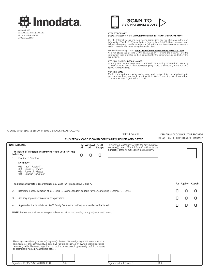Signature [PLEASE SIGN WITHIN BOX] Date Signature (Joint Owners) Date TO VOTE, MARK BLOCKS BELOW IN BLUE OR BLACK INK AS FOLLOWS: KEEP THIS PORTION FOR YOUR RECORDS DETACH AND RETURN THIS PORTION ONLY THIS PROXY CARD IS VALID ONLY WHEN SIGNED AND DATED. D84374 - P72698 The Board of Directors recommends you vote FOR proposals 2, 3 and 4. 2. Ratification of the selection of BDO India LLP as independent auditors for the year ending December 31, 2022. 3. Advisory approval of executive compensation. 4. Approval of the Innodata Inc. 2021 Equity Compensation Plan, as amended and restated. NOTE: Such other business as may properly come before the meeting or any adjournment thereof. 1. Election of Directors Nominees: 1) Jack S. Abuhoff 2) Louise C. Forlenza 3) Stewart R. Massey 4) Nauman (Nick) Toor For Withhold For All A ll Al l Except ! ! ! For Against Abstain ! ! ! ! ! ! ! ! ! INNODATA INC. To withhold authority to vote for any individual nominee(s), mark "For All Except" and write the number(s) of the nominee(s) on the line below . The Board of Directors recommends you vote FOR the following: INNODATA INC. 55 CHALLENGER ROAD, SUITE 202 RIDGEFIELD PARK, NJ 07660 ATTN: AMY AGRESS Please sign exactly as your name(s) appear(s) hereon . When signing as attorney, executor, administrator, or other fiduciary, please give full title as such . Joint owners should each sign personally . All holders must sign . If a corporation or partnership, please sign in full corporate or partnership name by authorized officer . VOTE BY INTERNET Before The Meeting - Go to www . proxyvote . com or scan the QR Barcode above Use the Internet to transmit your voting instructions and for electronic delivery of information . Vote by 11 : 59 p . m . Eastern Time on June 8 , 2022 . Have your proxy card in hand when you access the web site and follow the instructions to obtain your records and to create an electronic voting instruction form . During The Meeting - Go to www . virtualshareholdermeeting . com/INOD 2022 You may attend the meeting via the Internet and vote during the meeting . Have the information that is printed in the box marked by the arrow available and follow the instructions . VOTE BY PHONE - 1 - 800 - 690 - 6903 Use any touch - tone telephone to transmit your voting instructions . Vote by 11 : 59 P . M . ET on June 8 , 2022 . Have your proxy card in hand when you call and then follow the instructions . VOTE BY MAIL Mark, sign and date your proxy card and retur n it in the postage - paid envelope we have provided or return it to Vote Processing, c/o Broadridge, 51 Mercedes Way, Edgewood, NY 11717 . SCAN TO VIEW MATERIALS & VOTE w