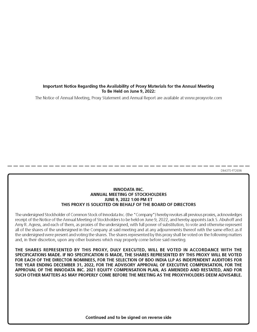 Important Notice Regarding the Availability of Proxy Materials for the Annual Meeting To Be Held on June 9, 2022: The Notice of Annual Meeting, Proxy Statement and Annual Report are available at www.proxyvote.com D84375 - P72698 INNODATA INC. ANNUAL MEETING OF STOCKHOLDERS JUNE 9, 2022 1:00 PM ET THIS PROXY IS SOLICITED ON BEHALF OF THE BOARD OF DIRECTORS The undersigned Stockholder of Common Stock of Innodata Inc . (the "Company") hereby revokes all previous proxies, acknowledges receipt of the Notice of the Annual Meeting of Stockholders to be held on June 9 , 2022 , and hereby appoints Jack S . Abuhoff and Amy R . Agress, and each of them, as proxies of the undersigned, with full power of substitution, to vote and otherwise represent all of the shares of the undersigned in the Company at said meeting and at any adjournments thereof with the same effect as if the undersigned were present and voting the shares . The shares represented by this proxy shall be voted on the following matters and, in their discretion, upon any other business which may properly come before said meeting . THE SHARES REPRESENTED BY THIS PROXY, DULY EXECUTED, WILL BE VOTED IN ACCORDANCE WITH THE SPECIFICATIONS MADE . IF NO SPECIFICATION IS MADE, THE SHARES REPRESENTED BY THIS PROXY WILL BE VOTED FOR EACH OF THE DIRECTOR NOMINEES, FOR THE SELECTION OF BDO INDIA LLP AS INDEPENDENT AUDITORS FOR THE YEAR ENDING DECEMBER 31 , 2022 , FOR THE ADVISORY APPROVAL OF EXECUTIVE COMPENSATION, FOR THE APPROVAL OF THE INNODATA INC . 2021 EQUITY COMPENSATION PLAN, AS AMENDED AND RESTATED, AND FOR SUCH OTHER MATTERS AS MAY PROPERLY COME BEFORE THE MEETING AS THE PROXYHOLDERS DEEM ADVISABLE . Continued and to be signed on reverse side