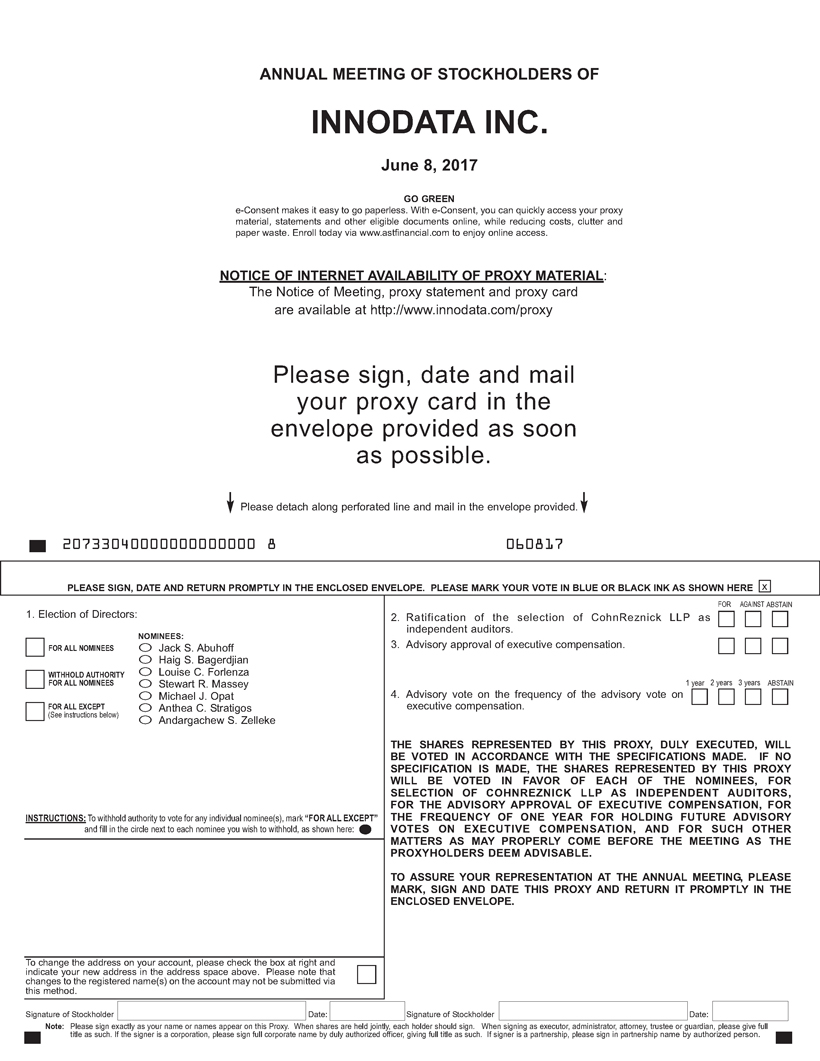 The Annual Meeting of Stockholders of Innodata Inc. (the "Company") will be held at Innodata Inc., 55 Challenger Road, Ridgefield Park, New Jersey 07660 at 11:00 A.M. on June 8, 2017, for the following purposes: