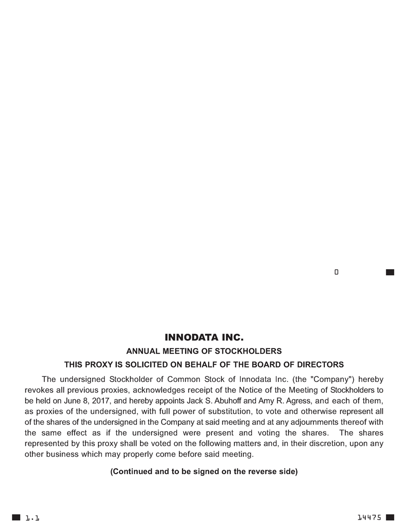 This Proxy Statement is furnished in connection with the solicitation by the Board of Directors of Innodata Inc. (the "Company") of Proxies in the form enclosed. Such Proxies will be voted at the Annual Meeting of Stockholders of the Company to be held at Innodata Inc., 55 Challenger Road, Ridgefield Park, New Jersey 07660 at 11:00 A.M. on June 8, 2017 (the "Meeting") and at any adjournments thereof for the purposes set forth in the accompanying Notice of Annual Meeting of Stockholders.