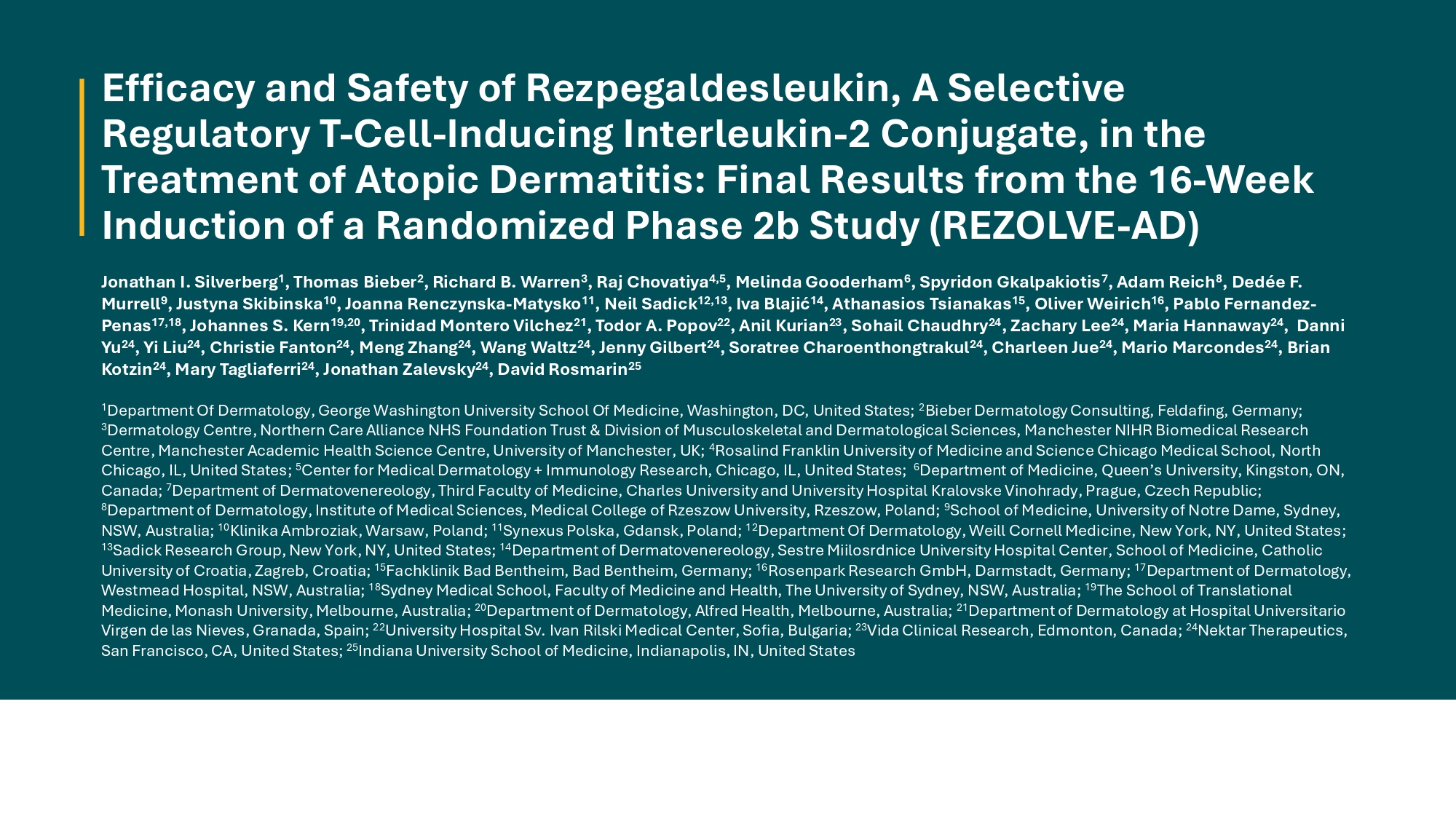 Efficacy and Safety of Rezpegaldesleukin, A Selective Regulatory T - Cell - Inducing Interleukin - 2 Conjugate, in the Treatment of Atopic Dermatitis: Final Results from the 16 - Week Induction of a Randomized Phase 2b Study (REZOLVE - AD) Jonathan I. Silverberg 1 , Thomas Bieber 2 , Richard B. Warren 3 , Raj Chovatiya 4,5 , Melinda Gooderham 6 , Spyridon Gkalpakiotis 7 , Adam Reich 8 , Dedée F. Murrell 9 , Justyna Skibinska 10 , Joanna Renczynska - Matysko 11 , Neil Sadick 12,13 , Iva Blajić 14 , Athanasios Tsianakas 15 , Oliver Weirich 16 , Pablo Fernandez - Penas 17,18 , Johannes S. Kern 19,20 , Trinidad Montero Vilchez 21 , Todor A. Popov 22 , Anil Kurian 23 , Sohail Chaudhry 24 , Zachary Lee 24 , Maria Hannaway 24 , Danni Yu 24 , Yi Liu 24 , Christie Fanton 24 , Meng Zhang 24 , Wang Waltz 24 , Jenny Gilbert 24 , Soratree Charoenthongtrakul 24 , Charleen Jue 24 , Mario Marcondes 24 , Brian Kotzin 24 , Mary Tagliaferri 24 , Jonathan Zalevsky 24 , David Rosmarin 25 1 Department Of Dermatology, George Washington University School Of Medicine, Washington, DC, United States; 2 Bieber Dermatology Consulting, Feldafing, Germany; 3 Dermatology Centre, Northern Care Alliance NHS Foundation Trust & Division of Musculoskeletal and Dermatological Sciences, Manchester NIHR Biomedical Research Centre, Manchester Academic Health Science Centre, University of Manchester, UK; 4 Rosalind Franklin University of Medicine and Science Chicago Medical School, North Chicago, IL, United States; 5 Center for Medical Dermatology + Immunology Research, Chicago, IL, United States; 6 Department of Medicine, Queen’s University, Kingston, ON, Canada; 7 Department of Dermatovenereology, Third Faculty of Medicine, Charles University and University Hospital Kralovske Vinohrady, Prague, Czech Republic; 8 Department of Dermatology, Institute of Medical Sciences, Medical College of Rzeszow University, Rzeszow, Poland; 9 School of Medicine, University of Notre Dame, Sydney, NSW, Australia; 10 Klinika Ambroziak, Warsaw, Poland; 11 Synexus Polska, Gdansk, Poland; 12 Department Of Dermatology, Weill Cornell Medicine, New York, NY, United States; 13 Sadick Research Group, New York, NY, United States; 14 Department of Dermatovenereology, Sestre Miilosrdnice University Hospital Center, School of Medicine, Catholic University of Croatia, Zagreb, Croatia; 15 Fachklinik Bad Bentheim, Bad Bentheim, Germany; 16 Rosenpark Research GmbH, Darmstadt, Germany; 17 Department of Dermatology, Westmead Hospital, NSW, Australia; 18 Sydney Medical School, Faculty of Medicine and Health, The University of Sydney, NSW, Australia; 19 The School of Translational Medicine, Monash University, Melbourne, Australia; 20 Department of Dermatology, Alfred Health, Melbourne, Australia; 21 Department of Dermatology at Hospital Universitario Virgen de las Nieves, Granada, Spain; 22 University Hospital Sv. Ivan Rilski Medical Center, Sofia, Bulgaria; 23 Vida Clinical Research, Edmonton, Canada; 24 Nektar Therapeutics, San Francisco, CA, United States; 25 Indiana University School of Medicine, Indianapolis, IN, United States