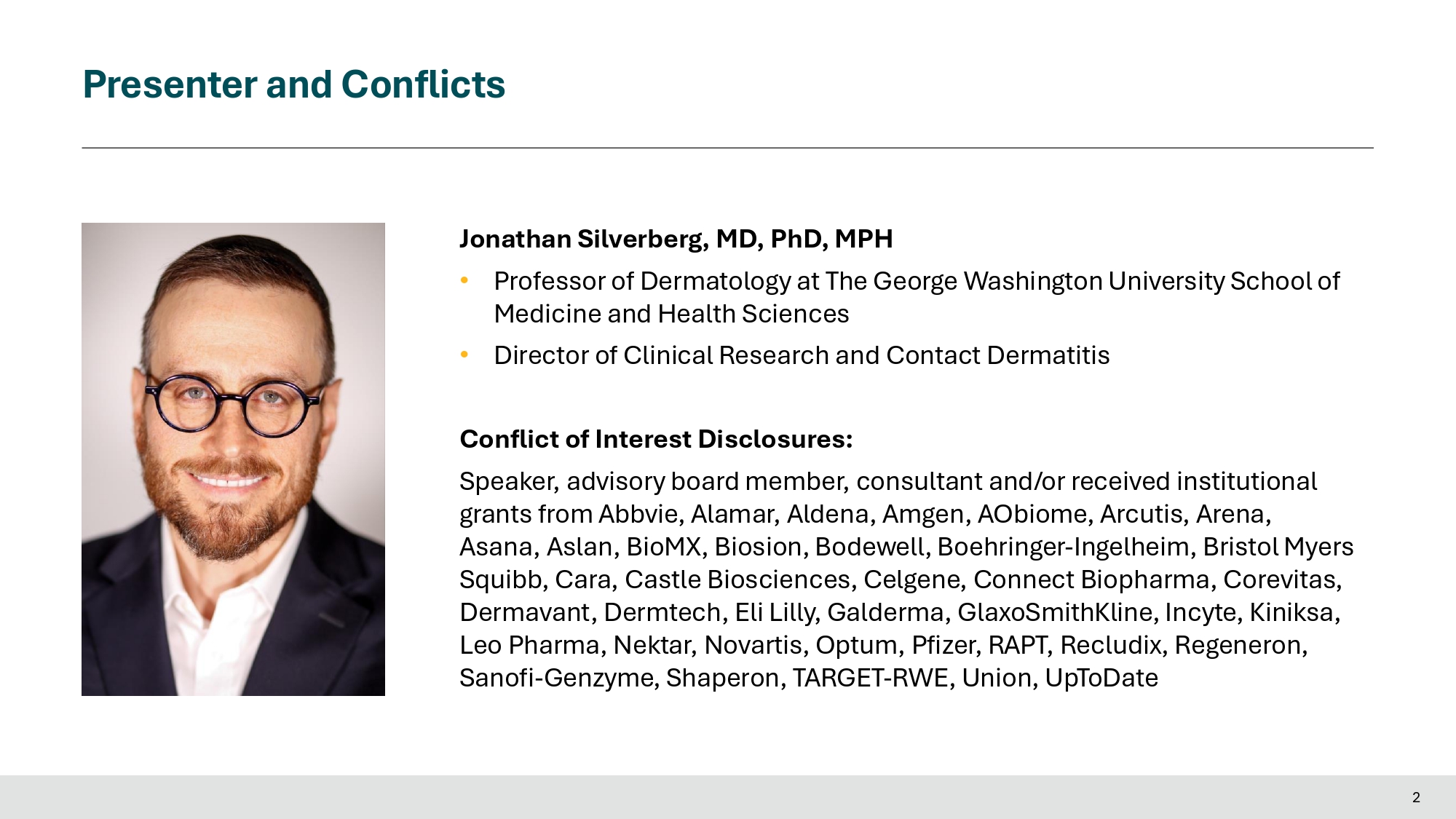 Presenter and Conflicts Jonathan Silverberg, MD, PhD, MPH • Professor of Dermatology at The George Washington University School of Medicine and Health Sciences • Director of Clinical Research and Contact Dermatitis Conflict of Interest Disclosures: Speaker, advisory board member, consultant and/or received institutional grants from Abbvie, Alamar, Aldena, Amgen, AObiome, Arcutis, Arena, Asana, Aslan, BioMX, Biosion, Bodewell, Boehringer - Ingelheim, Bristol Myers Squibb, Cara, Castle Biosciences, Celgene, Connect Biopharma, Corevitas, Dermavant, Dermtech, Eli Lilly, Galderma, GlaxoSmithKline, Incyte, Kiniksa, Leo Pharma, Nektar, Novartis, Optum, Pfizer, RAPT, Recludix, Regeneron, Sanofi - Genzyme, Shaperon, TARGET - RWE, Union, UpToDate 2