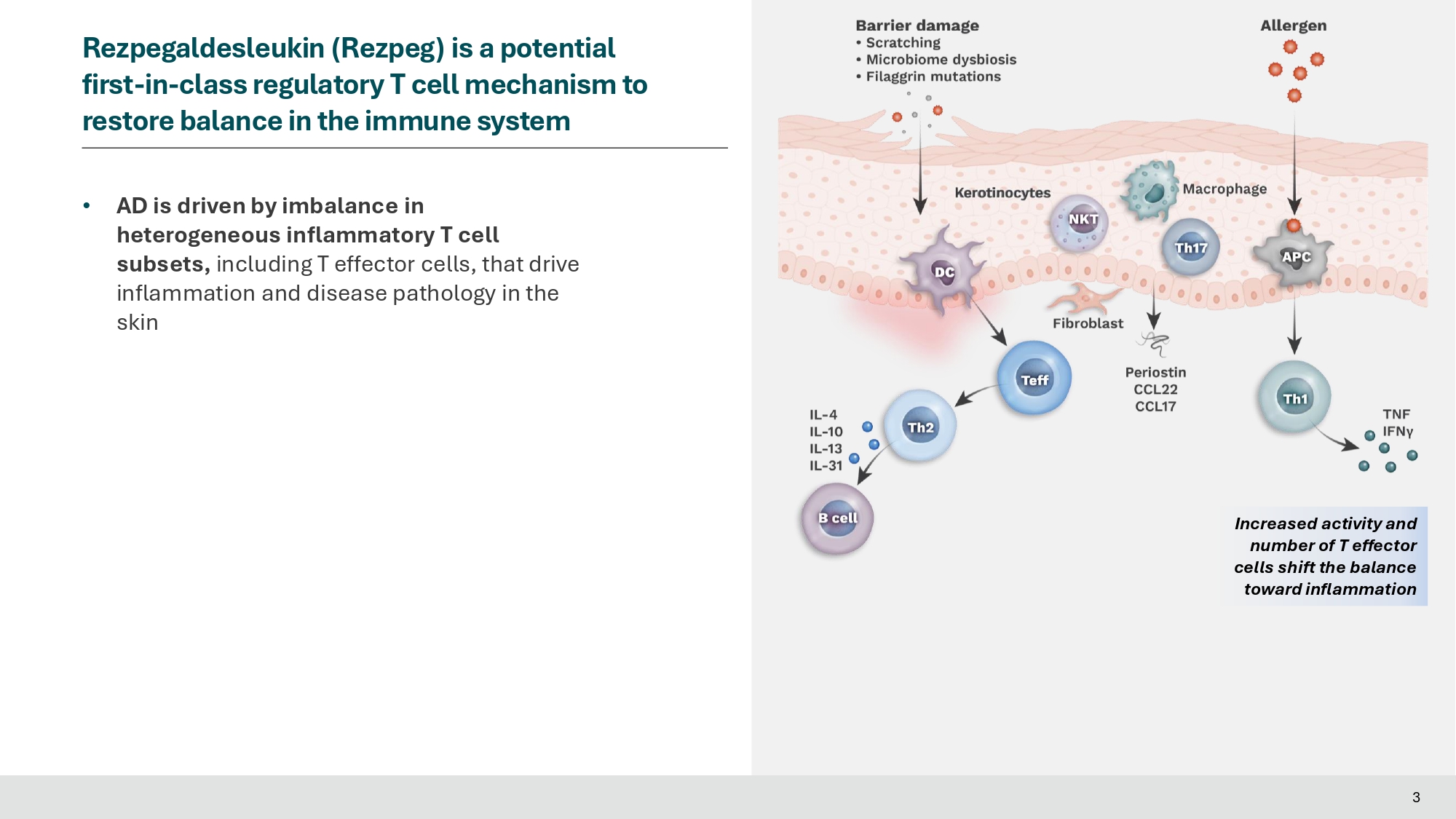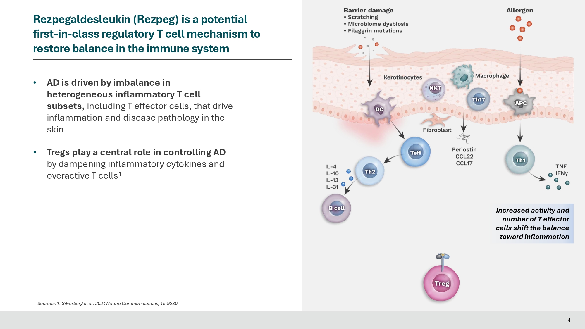 • AD is driven by imbalance in heterogeneous inflammatory T cell subsets, including T effector cells, that drive inflammation and disease pathology in the skin 3 Rezpegaldesleukin (Rezpeg) is a potential first - in - class regulatory T cell mechanism to restore balance in the immune system Increased activity and number of T effector cells shift the balance toward inflammation