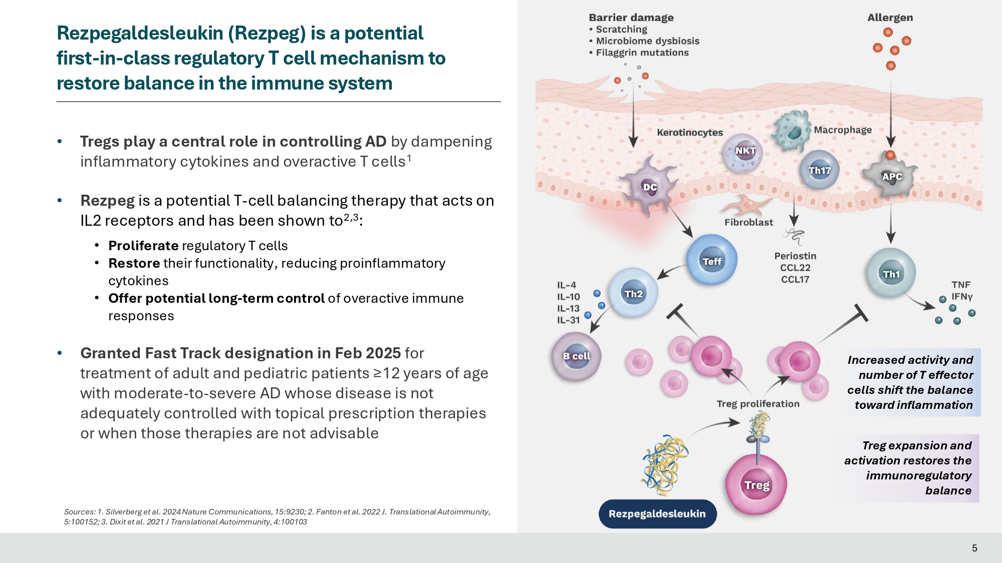 Rezpegaldesleukin (Rezpeg) is a potential first - in - class regulatory T cell mechanism to restore balance in the immune system Sources: 1. Silverberg et al. 2024 Nature Communications, 15:9230; 2. Fanton et al. 2022 J. Translational Autoimmunity, • Tregs play a central role in controlling AD by dampening inflammatory cytokines and overactive T cells 1 • Rezpeg is a potential T - cell balancing therapy that acts on IL2 receptors and has been shown to 2,3 : • Proliferate regulatory T cells • Restore their functionality, reducing proinflammatory cytokines • Offer potential long - term control of overactive immune responses • Granted Fast Track designation in Feb 2025 for treatment of adult and pediatric patients ≥12 years of age with moderate - to - severe AD whose disease is not adequately controlled with topical prescription therapies or when those therapies are not advisable Treg expansion and activation restores the immunoregulatory balance Increased activity and number of T effector cells shift the balance toward inflammation 5:100152; 3. Dixit et al. 2021 J Translational Autoimmunity, 4:100103 5