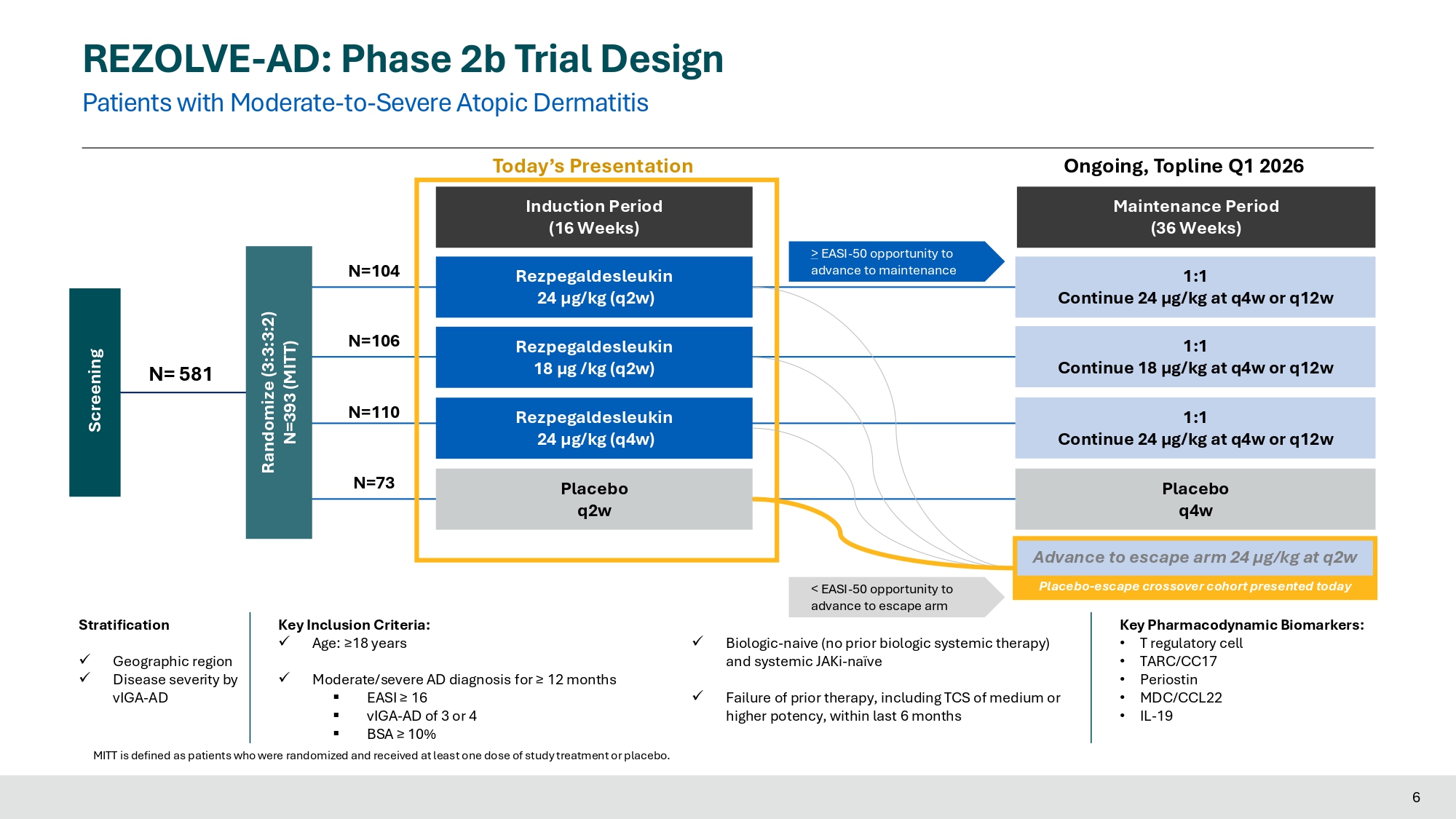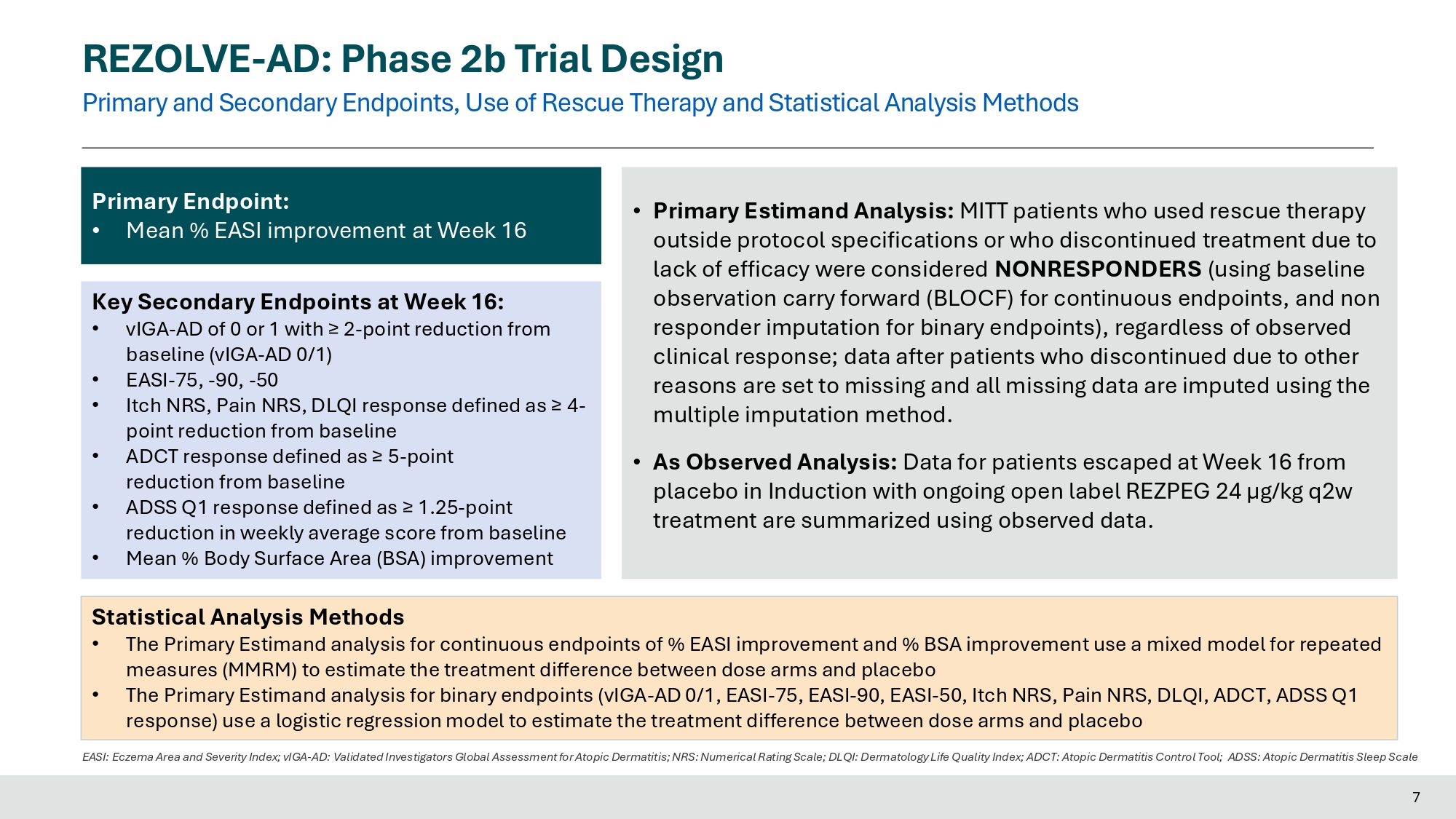 REZOLVE - AD: Phase 2b Trial Design Patients with Moderate - to - Severe Atopic Dermatitis Induction Period (16 Weeks) Maintenance Period (36 Weeks) Key Inclusion Criteria: x Age: ≥18 years x Moderate/severe AD diagnosis for ≥ 12 months ▪ EASI ≥ 16 ▪ vIGA - AD of 3 or 4 ▪ BSA ≥ 10% x Biologic - naive (no prior biologic systemic therapy) and systemic JAKi - naïve x Failure of prior therapy, including TCS of medium or higher potency, within last 6 months Stratification x Geographic region x Disease severity by vIGA - AD Key Pharmacodynamic Biomarkers: • T regulatory cell • TARC/CC17 • Periostin • MDC/CCL22 • IL - 19 Randomize (3:3:3:2) N=393 (MITT) 1:1 Continue 24 µg/kg at q4w or q12w Rezpegaldesleukin 24 µg/kg (q2w) Rezpegaldesleukin 24 µg/kg (q4w) Placebo q4w Rezpegaldesleukin 18 µg /kg (q2w) Placebo q2w Screening N= 581 N=106 N=110 N=73 N=104 1:1 Continue 18 µg/kg at q4w or q12w 1:1 Continue 24 µg/kg at q4w or q12w > EASI - 50 opportunity to advance to maintenance Today’s Presentation Ongoing, Topline Q1 2026 MITT is defined as patients who were randomized and received at least one dose of study treatment or placebo. < EASI - 50 opportunity to advance to escape arm Advance to escape arm 24 µg/kg at q2w Placebo - escape crossover cohort presented today 6