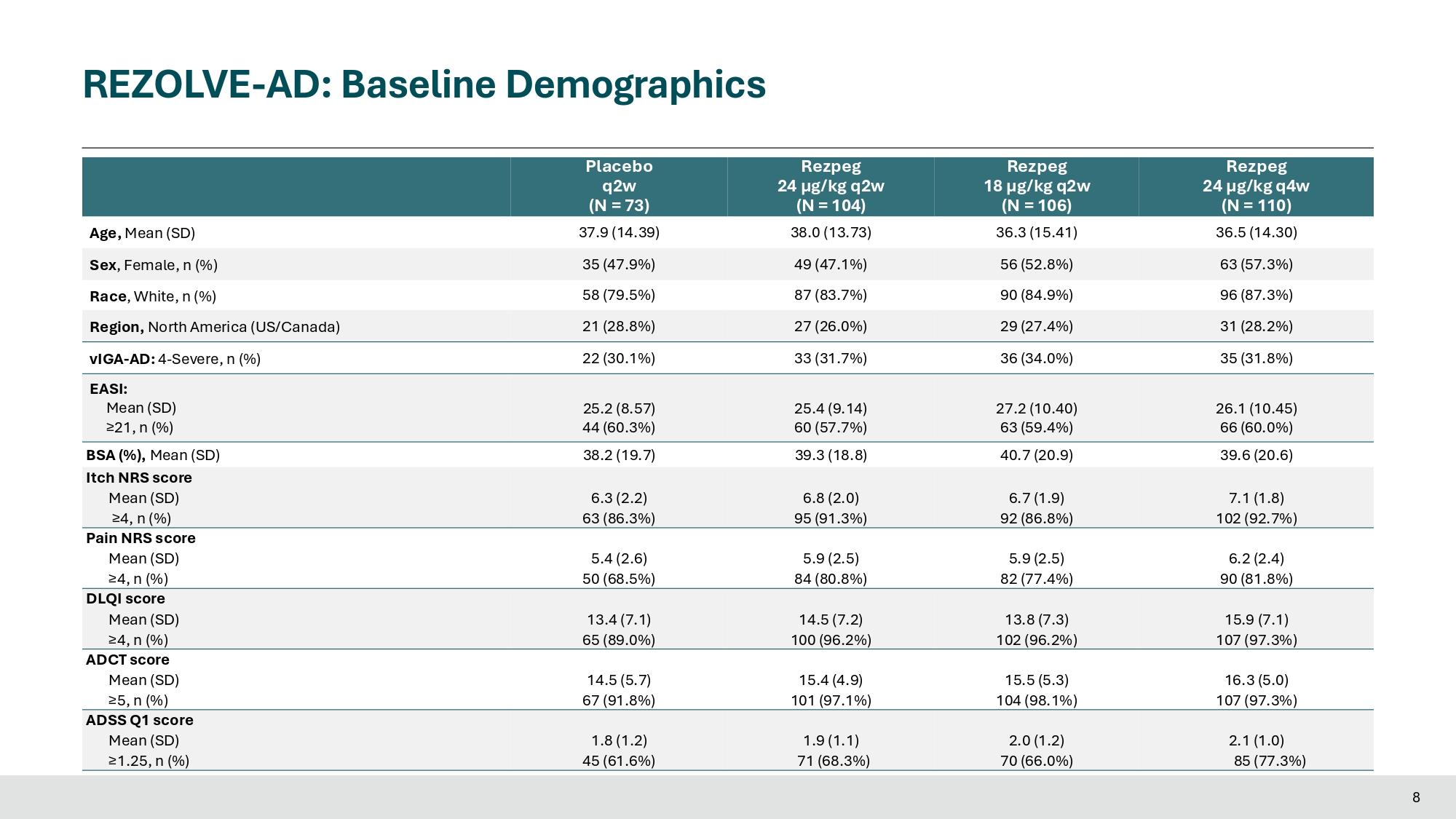 Rezpeg 24 µg/kg q4w (N = 110) Rezpeg (N = 106) Rezpeg (N = 104) Placebo (N = 73) 36.5 (14.30) 36.3 (15.41) 38.0 (13.73) 37.9 (14.39) Age, Mean (SD) 63 (57.3%) 56 (52.8%) 49 (47.1%) 35 (47.9%) Sex , Female, n (%) 96 (87.3%) 90 (84.9%) 87 (83.7%) 58 (79.5%) Race , White, n (%) 31 (28.2%) 29 (27.4%) 27 (26.0%) 21 (28.8%) Region, North America (US/Canada) 35 (31.8%) 36 (34.0%) 33 (31.7%) 22 (30.1%) vIGA - AD: 4 - Severe, n (%) EASI: 26.1 (10.45) 27.2 (10.40) 25.4 (9.14) 25.2 (8.57) Mean (SD) 66 (60.0%) 63 (59.4%) 60 (57.7%) 44 (60.3%) ≥21, n (%) 39.6 (20.6) 40.7 (20.9) 39.3 (18.8) 38.2 (19.7) BSA (%), Mean (SD) Itch NRS score 7.1 (1.8) 6.7 (1.9) 6.8 (2.0) 6.3 (2.2) Mean (SD) 102 (92.7%) 92 (86.8%) 95 (91.3%) 63 (86.3%) ≥4, n (%) Pain NRS score 6.2 (2.4) 5.9 (2.5) 5.9 (2.5) 5.4 (2.6) Mean (SD) 90 (81.8%) 82 (77.4%) 84 (80.8%) 50 (68.5%) ≥4, n (%) DLQI score 15.9 (7.1) 13.8 (7.3) 14.5 (7.2) 13.4 (7.1) Mean (SD) 107 (97.3%) 102 (96.2%) 100 (96.2%) 65 (89.0%) ≥4, n (%) ADCT score 16.3 (5.0) 15.5 (5.3) 15.4 (4.9) 14.5 (5.7) Mean (SD) 107 (97.3%) 104 (98.1%) 101 (97.1%) 67 (91.8%) ≥5, n (%) ADSS Q1 score 2.1 (1.0) 2.0 (1.2) 1.9 (1.1) 1.8 (1.2) Mean (SD) 85 (77.3%) 70 (66.0%) 71 (68.3%) 45 (61.6%) ≥1.25, n (%) 8 REZOLVE - AD: Baseline Demographics