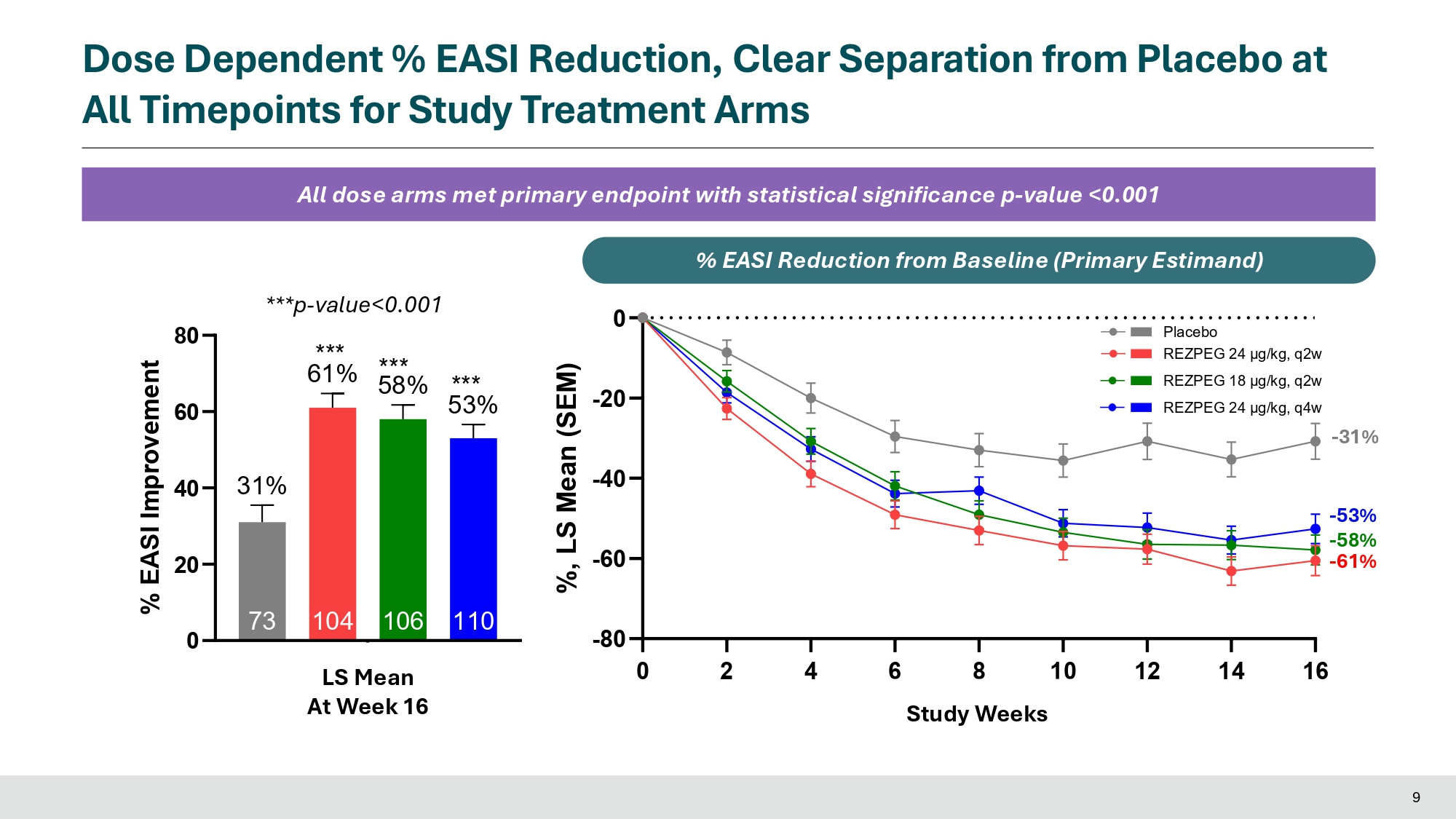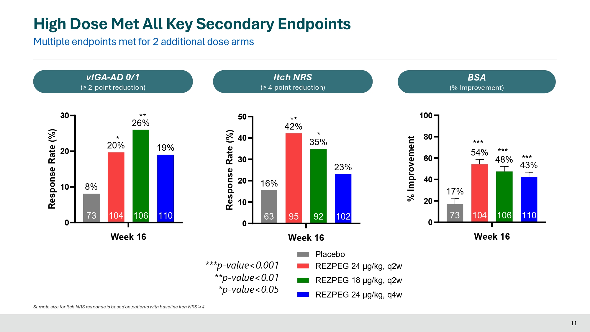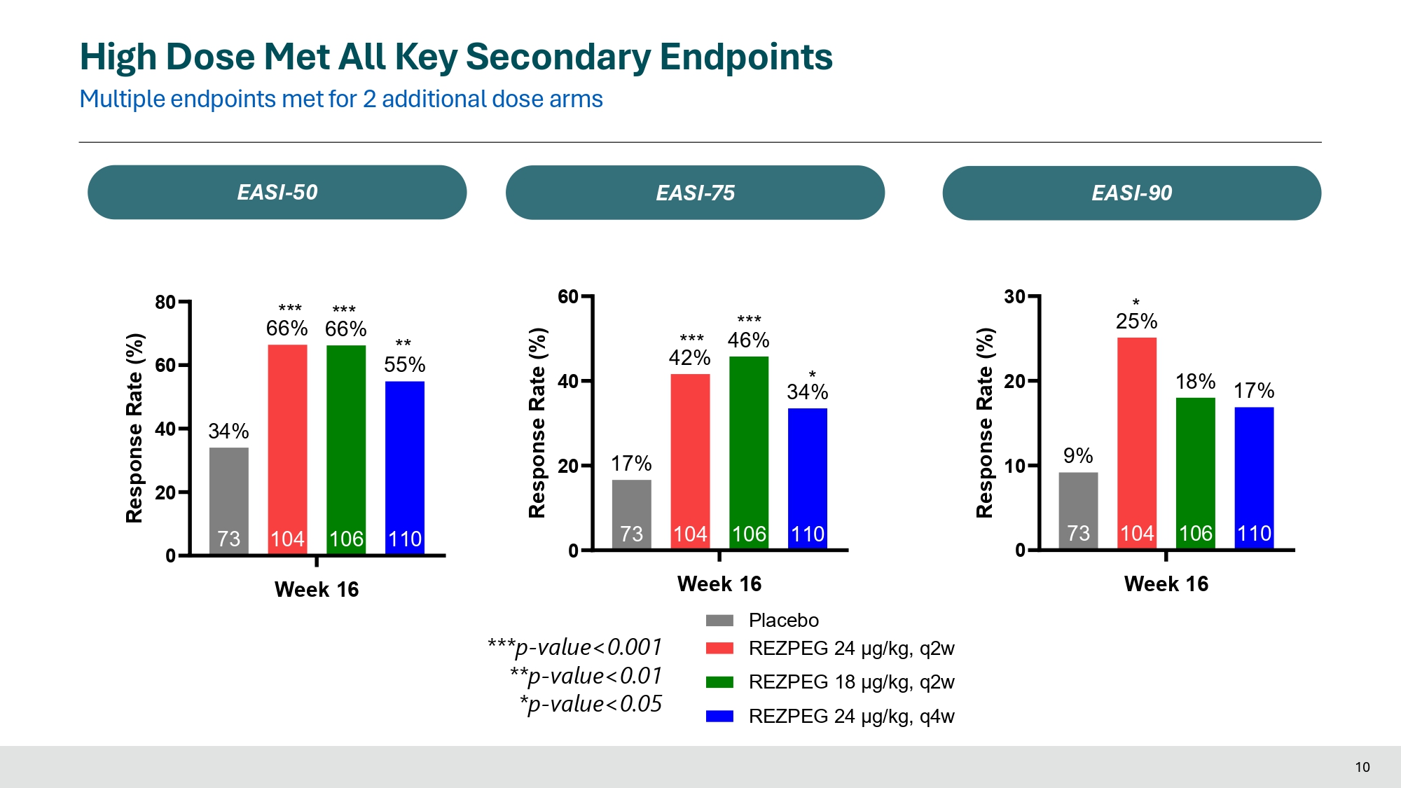 0 20 40 60 80 110 106 104 66% 66% 73 34% Week 16 Response Rate (%) *** *** ** 55% 0 20 40 60 110 34% 106 104 42% 73 17% Response Rate (%) *** *** 46% * 0 10 20 30 110 17% 106 18% 104 25% 73 9% Week 16 Response Rate (%) * High Dose Met All Key Secondary Endpoints Multiple endpoints met for 2 additional dose arms EASI - 50 EASI - 75 EASI - 90 ***p - value<0.001 **p - value<0.01 *p - value<0.05 Week 16 Placebo REZPEG 24 μg/kg, q2w REZPEG 18 μg/kg, q2w REZPEG 24 μg/kg, q4w 10
