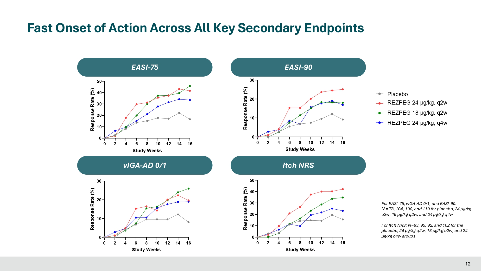 0 20 30 110 19% 106 26% 104 20% 73 10 8% Week 16 Response Rate (%) * ** 0 10 20 30 40 50 102 23% 92 35% 95 42% 63 16% Response Rate (%) ** * 0 20 40 60 80 100 110 43% 106 104 73 17% *** 54% *** 48% Week 16 % Improvement *** High Dose Met All Key Secondary Endpoints Multiple endpoints met for 2 additional dose arms vIGA - AD 0/1 (≥ 2 - point reduction) Itch NRS (≥ 4 - point reduction) BSA (% Improvement) ***p - value<0.001 **p - value<0.01 *p - value<0.05 Week 16 Placebo REZPEG 24 μg/kg, q2w REZPEG 18 μg/kg, q2w REZPEG 24 μg/kg, q4w Sample size for Itch NRS response is based on patients with baseline Itch NRS ≥ 4 11