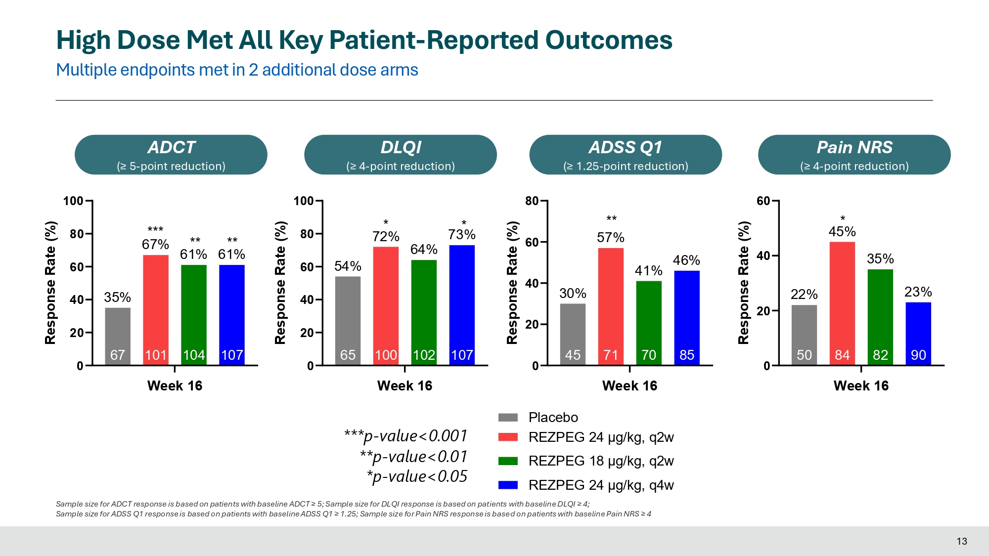 Fast Onset of Action Across All Key Secondary Endpoints 0 2 4 6 8 10 12 14 16 0 10 20 30 Study Weeks Response Rate (%) 0 2 4 6 8 10 12 14 16 Study Weeks 0 10 20 30 Response Rate (%) 0 2 4 6 8 10 12 14 16 Study Weeks 0 10 20 30 40 50 Itch NRS Response Rate (%) 0 2 4 6 8 10 12 14 16 Study Weeks 0 10 20 30 40 50 Response Rate (%) E A E A S S I - I - 7 7 5 5 E A E A S S I I - - 9 9 0 0 vIGA - AD 0/1 vIGA - AD 0/1 Itch NRS For EASI - 75, vIGA - AD 0/1, and EASI - 90: N = 73, 104, 106, and 110 for placebo, 24 µg/kg q2w, 18 µg/kg q2w, and 24 µg/kg q4w 12 For Itch NRS: N=63, 95, 92, and 102 for the placebo, 24 µg/kg q2w, 18 µg/kg q2w, and 24 µg/kg q4w groups Placebo REZPEG 24 μg/kg, q2w REZPEG 18 μg/kg, q2w REZPEG 24 μg/kg, q4w