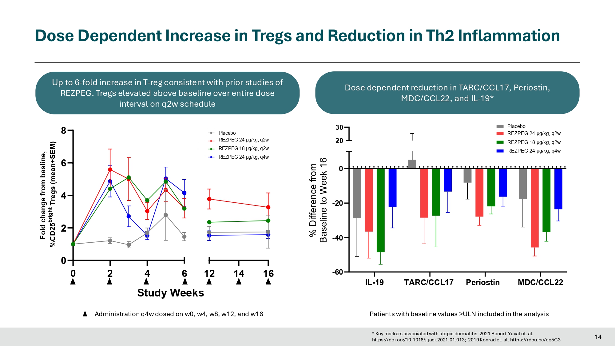 Dose Dependent Increase in Tregs and Reduction in Th2 Inflammation 14 Patients with baseline values >ULN included in the analysis IL - 19 TARC/CCL17 Periostin MDC/CCL22 - 60 - 40 - 20 0 30 20 % Difference from Baseline to Week 16 Placebo REZPEG 24 μg/kg, q2w REZPEG 18 μg/kg, q2w REZPEG 24 μg/kg, q4w 0 2 0 2 4 6 8 4 6 12 14 16 Study Weeks Fold change from basline, %CD25 bright Tregs (mean + SEM) Up to 6 - fold increase in T - reg consistent with prior studies of REZPEG. Tregs elevated above baseline over entire dose interval on q2w schedule Administration q4w dosed on w0, w4, w8, w12, and w16 Dose dependent reduction in TARC/CCL17, Periostin, MDC/CCL22, and IL - 19* Placebo REZPEG 24 μg/kg, q2w REZPEG 18 μg/kg, q2w REZPEG 24 μg/kg, q4w https://doi.org/10.1016/j.jaci.2021.01.013 ; 2019 Konrad et. al. https://rdcu.be/eq5C3 * Key markers associated with atopic dermatitis: 2021 Renert - Yuval et. al.