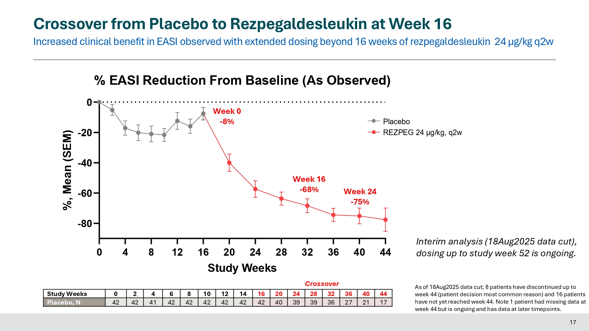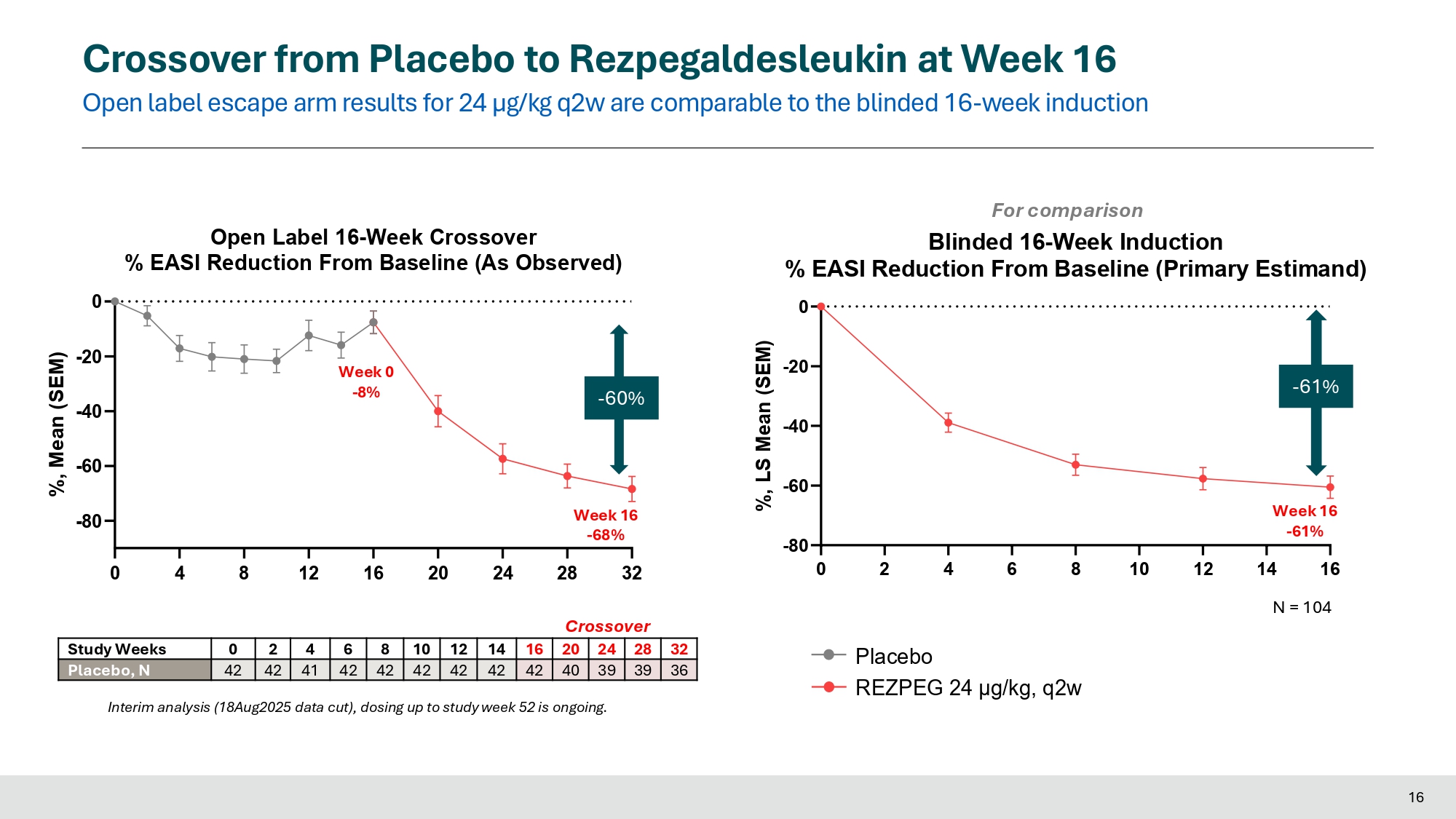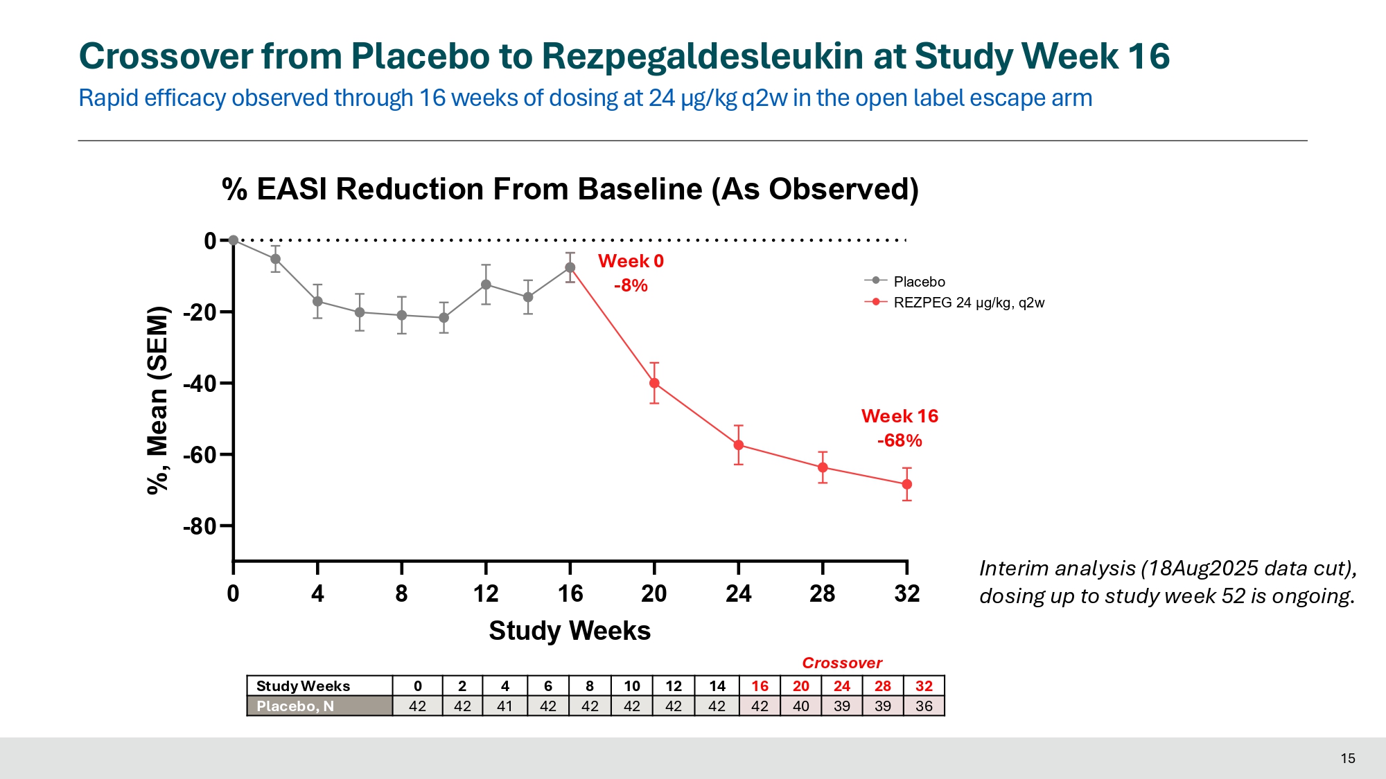 Crossover from Placebo to Rezpegaldesleukin at Week 16 Open label escape arm results for 24 µg/kg q2w are comparable to the blinded 16 - week induction Placebo REZPEG 24 μg/kg, q2w 0 4 8 12 16 20 24 - 80 - 60 - 40 - 20 0 Open Label 16 - Week Crossover % EASI Reduction From Baseline (As Observed) %, Mean (SEM) 32 28 24 20 16 14 12 10 8 6 4 2 0 Study Weeks 36 39 39 40 42 42 42 42 42 42 41 42 42 Placebo, N Interim analysis (18Aug2025 data cut), dosing up to study week 52 is ongoing. Week 0 - 8% 0 2 4 6 8 10 12 - 80 - 60 - 40 - 20 0 For comparison Blinded 16 - Week Induction % EASI Reduction From Baseline (Primary Estimand) %, LS Mean (SEM) - 60% 16 Week 16 - 68% 28 32 Crossover - 61% Week 16 - 61% 14 16 N = 104