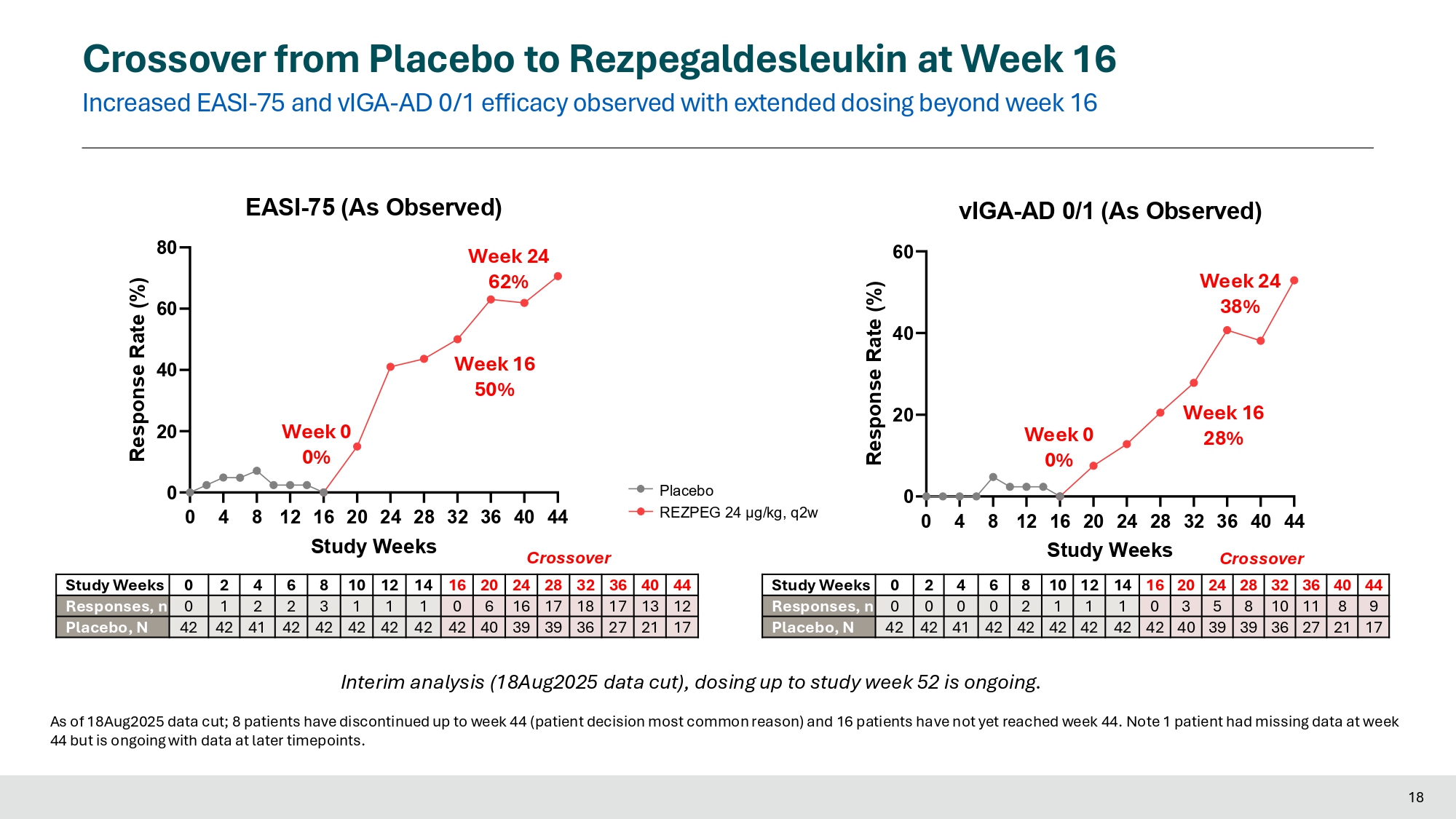 Crossover from Placebo to Rezpegaldesleukin at Week 16 Increased clinical benefit in EASI observed with extended dosing beyond 16 weeks of rezpegaldesleukin 24 µg/kg q2w Placebo REZPEG 24 μg/kg, q2w 0 4 8 12 16 20 24 28 32 36 40 44 17 - 80 - 60 - 40 - 20 % EASI Reduction From Baseline (As Observed) 0 Study Weeks %, Mean (SEM) Week 16 - 68% Week 0 - 8% Week 24 - 75% 44 40 36 32 28 24 20 16 14 12 10 8 6 4 2 0 Study Weeks 17 21 27 36 39 39 40 42 42 42 42 42 42 41 42 42 Placebo, N As of 18Aug2025 data cut; 8 patients have discontinued up to week 44 (patient decision most common reason) and 16 patients have not yet reached week 44. Note 1 patient had missing data at week 44 but is ongoing and has data at later timepoints. Interim analysis (18Aug2025 data cut), dosing up to study week 52 is ongoing. Crossover