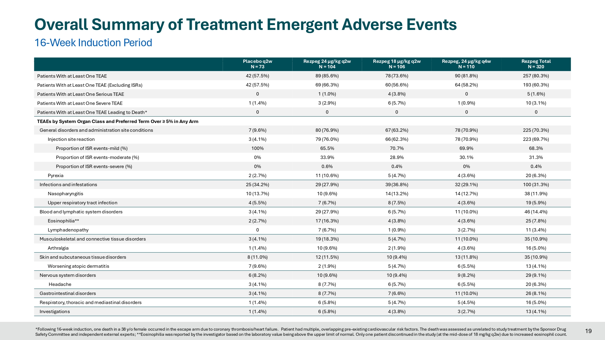 Rezpeg Total N = 320 Rezpeg, 24 µg/kg q4w N = 110 Rezpeg 18 µg/kg q2w N = 106 Rezpeg 24 µg/kg q2w N = 104 Placebo q2w N = 73 257 (80.3%) 90 (81.8%) 78 (73.6%) 89 (85.6%) 42 (57.5%) Patients With at Least One TEAE 193 (60.3%) 64 (58.2%) 60 (56.6%) 69 (66.3%) 42 (57.5%) Patients With at Least One TEAE (Excluding ISRs) 5 (1.6%) 0 4 (3.8%) 1 (1.0%) 0 Patients With at Least One Serious TEAE 10 (3.1%) 1 (0.9%) 6 (5.7%) 3 (2.9%) 1 (1.4%) Patients With at Least One Severe TEAE 0 0 0 0 0 Patients With at Least One TEAE Leading to Death* TEAEs by System Organ Class and Preferred Term Over ≥ 5% in Any Arm 225 (70.3%) 78 (70.9%) 67 (63.2%) 80 (76.9%) 7 (9.6%) General disorders and administration site conditions 223 (69.7%) 78 (70.9%) 66 (62.3%) 79 (76.0%) 3 (4.1%) Injection site reaction 68.3% 69.9% 70.7% 65.5% 100% Proportion of ISR events - mild (%) 31.3% 30.1% 28.9% 33.9% 0% Proportion of ISR events - moderate (%) 0.4% 0% 0.4% 0.6% 0% Proportion of ISR events - severe (%) 20 (6.3%) 4 (3.6%) 5 (4.7%) 11 (10.6%) 2 (2.7%) Pyrexia 100 (31.3%) 32 (29.1%) 39 (36.8%) 29 (27.9%) 25 (34.2%) Infections and infestations 38 (11.9%) 14 (12.7%) 14 (13.2%) 10 (9.6%) 10 (13.7%) Nasopharyngitis 19 (5.9%) 4 (3.6%) 8 (7.5%) 7 (6.7%) 4 (5.5%) Upper respiratory tract infection 46 (14.4%) 11 (10.0%) 6 (5.7%) 29 (27.9%) 3 (4.1%) Blood and lymphatic system disorders 25 (7.8%) 4 (3.6%) 4 (3.8%) 17 (16.3%) 2 (2.7%) Eosinophilia** 11 (3.4%) 3 (2.7%) 1 (0.9%) 7 (6.7%) 0 Lymphadenopathy 35 (10.9%) 11 (10.0%) 5 (4.7%) 19 (18.3%) 3 (4.1%) Musculoskeletal and connective tissue disorders 16 (5.0%) 4 (3.6%) 2 (1.9%) 10 (9.6%) 1 (1.4%) Arthralgia 35 (10.9%) 13 (11.8%) 10 (9.4%) 12 (11.5%) 8 (11.0%) Skin and subcutaneous tissue disorders 13 (4.1%) 6 (5.5%) 5 (4.7%) 2 (1.9%) 7 (9.6%) Worsening atopic dermatitis 29 (9.1%) 9 (8.2%) 10 (9.4%) 10 (9.6%) 6 (8.2%) Nervous system disorders 20 (6.3%) 6 (5.5%) 6 (5.7%) 8 (7.7%) 3 (4.1%) Headache 26 (8.1%) 11 (10.0%) 7 (6.6%) 8 (7.7%) 3 (4.1%) Gastrointestinal disorders 16 (5.0%) 5 (4.5%) 5 (4.7%) 6 (5.8%) 1 (1.4%) Respiratory, thoracic and mediastinal disorders 13 (4.1%) 3 (2.7%) 4 (3.8%) 6 (5.8%) 1 (1.4%) Investigations Overall Summary of Treatment Emergent Adverse Events 16 - Week Induction Period 19 *Following 16 - week induction, one death in a 38 y/o female occurred in the escape arm due to coronary thrombosis/heart failure. Patient had multiple, overlapping pre - existing cardiovascular risk factors. The death was assessed as unrelated to study treatment by the Sponsor Drug Safety Committee and independent external experts; **Eosinophilia was reported by the investigator based on the laboratory value being above the upper limit of normal. Only one patient discontinued in the study (at the mid - dose of 18 mg/kg q2w) due to increased eosinophil count.