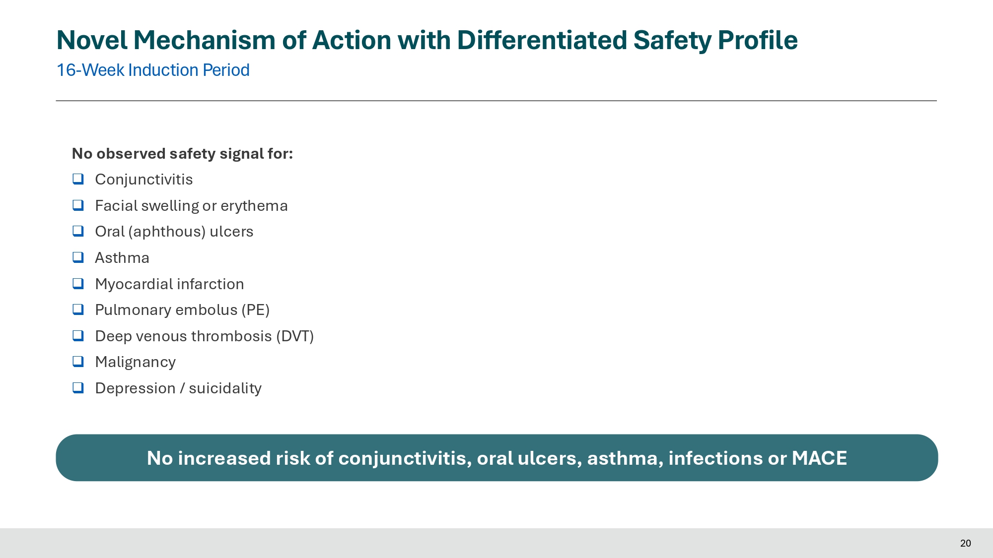 Novel Mechanism of Action with Differentiated Safety Profile 16 - Week Induction Period No observed safety signal for: □ Conjunctivitis □ Facial swelling or erythema □ Oral (aphthous) ulcers □ Asthma □ Myocardial infarction □ Pulmonary embolus (PE) □ Deep venous thrombosis (DVT) □ Malignancy □ Depression / suicidality No increased risk of conjunctivitis, oral ulcers, asthma, infections or MACE 20