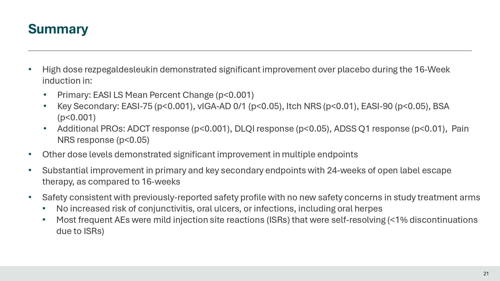 Crossover from Placebo to Rezpegaldesleukin at Week 16 Increased EASI - 75 and vIGA - AD 0/1 efficacy observed with extended dosing beyond week 16 44 40 36 32 28 24 20 16 14 12 10 8 6 4 2 0 Study Weeks 12 13 17 18 17 16 6 0 1 1 1 3 2 2 1 0 Responses, n 17 21 27 36 39 39 40 42 42 42 42 42 42 41 42 42 Placebo, N 44 40 36 32 28 24 20 16 14 12 10 8 6 4 2 0 Study Weeks 9 8 11 10 8 5 3 0 1 1 1 2 0 0 0 0 Responses, n 17 21 27 36 39 39 40 42 42 42 42 42 42 41 42 42 Placebo, N 0 20 40 60 80 Response Rate (%) Week 16 50% Week 0 0% EASI - 75 (As Observed) Week 24 62% 0 4 8 12 16 20 24 28 32 36 40 44 Study Weeks Crossover 0 4 8 12 16 20 24 28 32 36 40 44 0 20 40 60 vIGA - AD 0/1 (As Observed) Study Weeks Response Rate (%) Week 16 28% Week 0 0% Week 24 38% Interim analysis (18Aug2025 data cut), dosing up to study week 52 is ongoing. As of 18Aug2025 data cut; 8 patients have discontinued up to week 44 (patient decision most common reason) and 16 patients have not yet reached week 44. Note 1 patient had missing data at week 44 but is ongoing with data at later timepoints. Placebo REZPEG 24 μg/kg, q2w Crossover 18