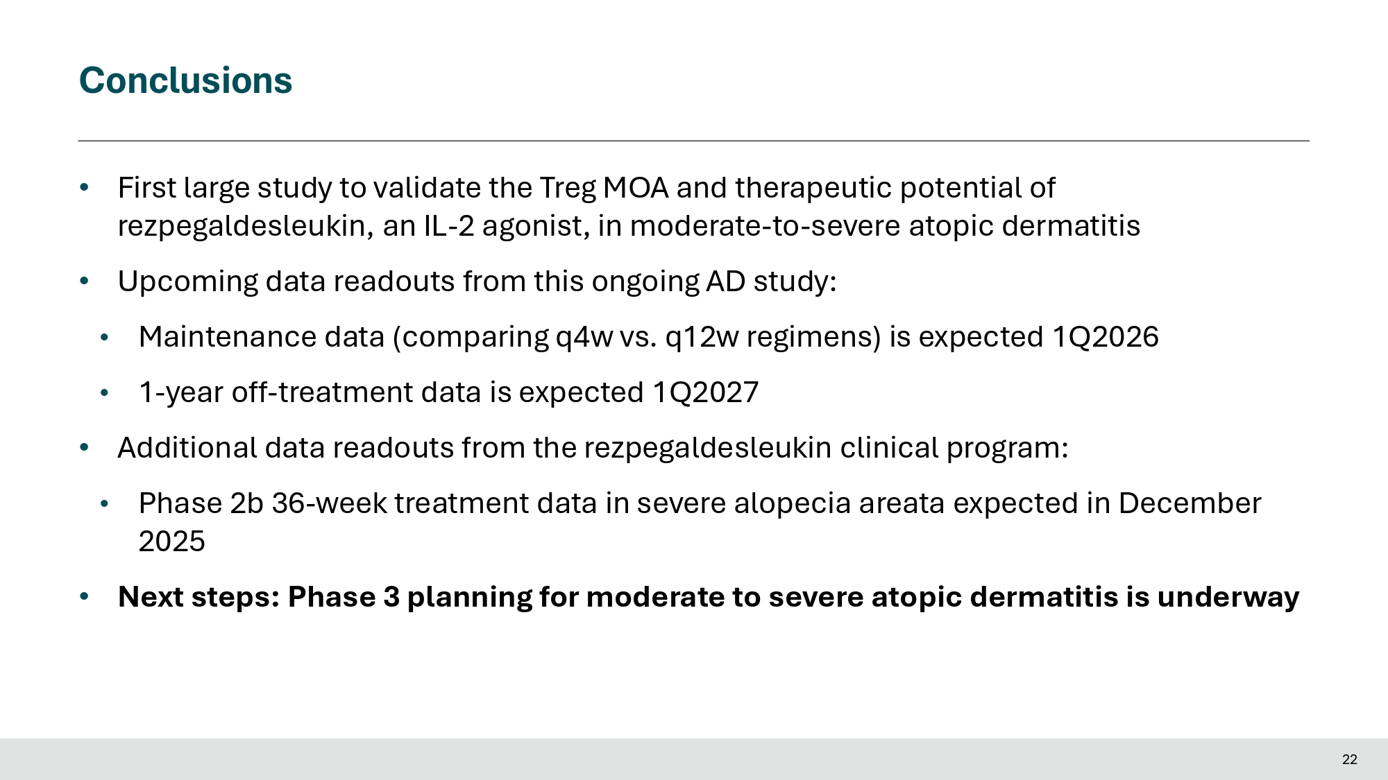 Conclusions 22 • First large study to validate the Treg MOA and therapeutic potential of rezpegaldesleukin, an IL - 2 agonist, in moderate - to - severe atopic dermatitis • Upcoming data readouts from this ongoing AD study: • Maintenance data (comparing q4w vs. q12w regimens) is expected 1Q2026 • 1 - year off - treatment data is expected 1Q2027 • Additional data readouts from the rezpegaldesleukin clinical program: • Phase 2b 36 - week treatment data in severe alopecia areata expected in December 2025 • Next steps: Phase 3 planning for moderate to severe atopic dermatitis is underway