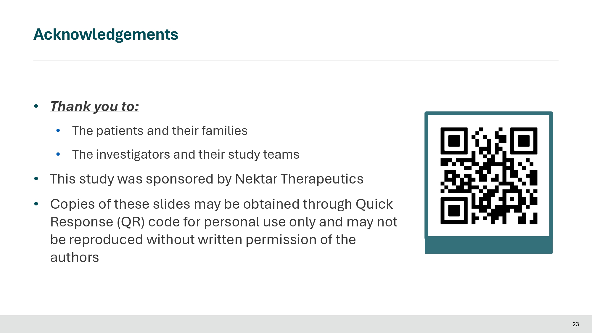 Acknowledgements 23 • Thank you to: • The patients and their families • The investigators and their study teams • This study was sponsored by Nektar Therapeutics • Copies of these slides may be obtained through Quick Response (QR) code for personal use only and may not be reproduced without written permission of the authors