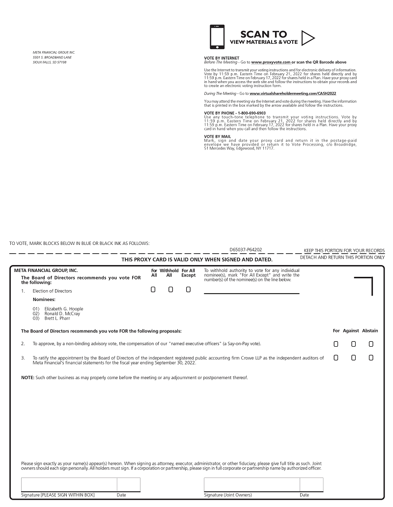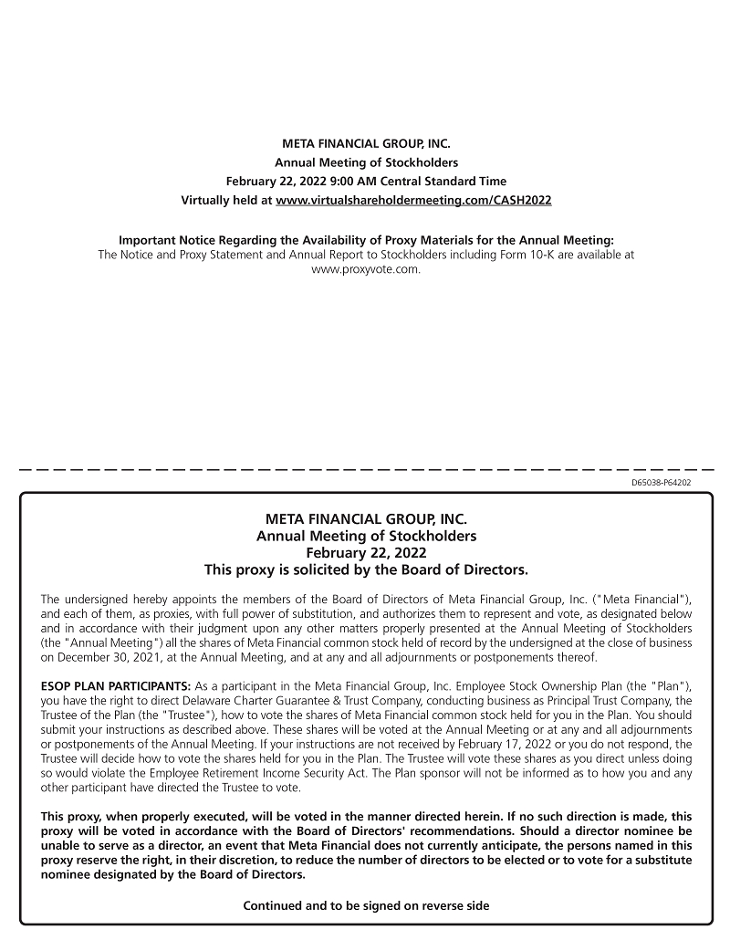 Important Notice Regarding the Availability of Proxy Materials for the 2022 Annual Meeting of Stockholders to be Held on February 22, 2022: Meta Financial’s Notice of Internet Availability of Proxy Materials, Proxy Statement, and Annual Report to Stockholders, including Meta Financial’s Annual Report on Form 10-K for the fiscal year ended September 30, 2021, are available at www.proxydocs.com/CASH.
