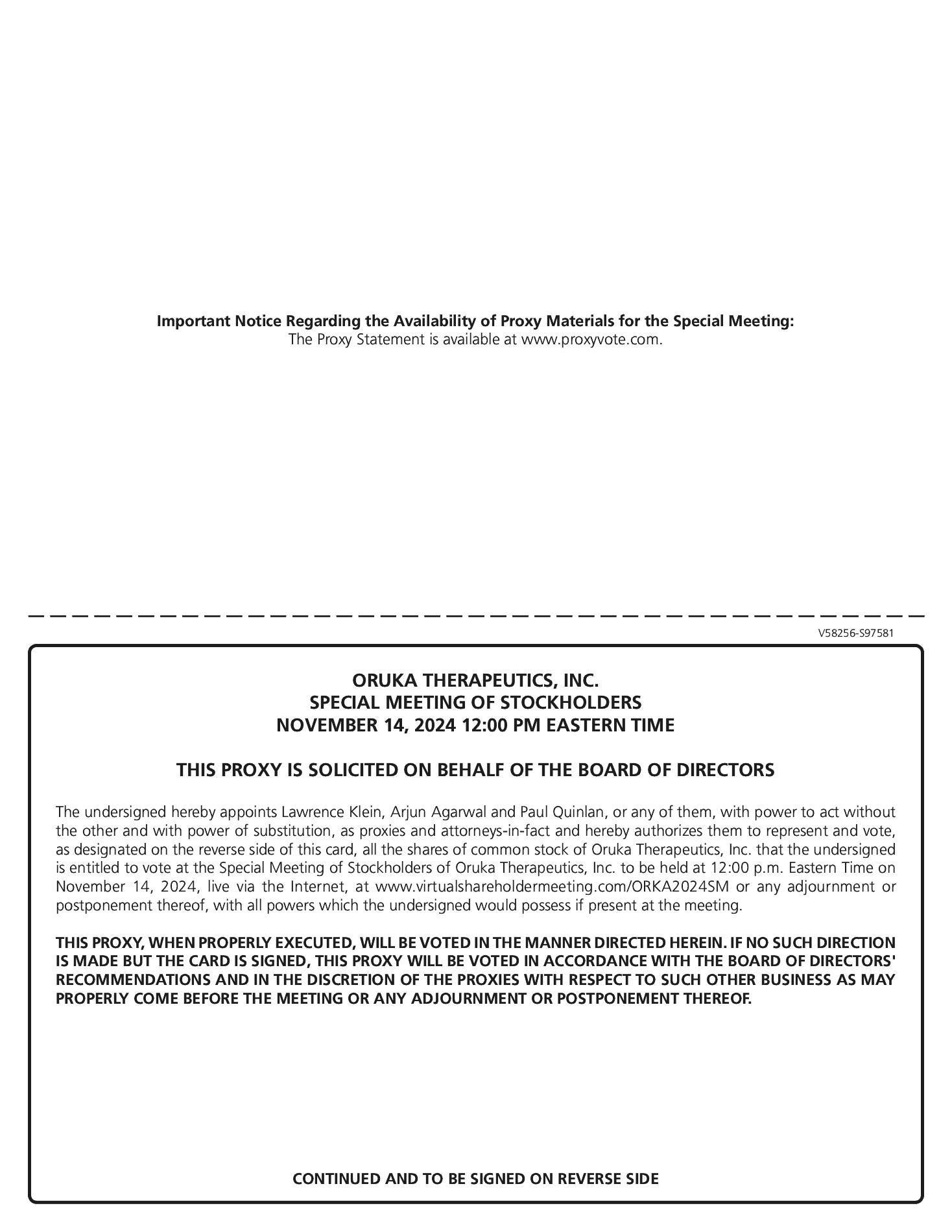 Oruka Therapeutics, Inc. (the “Company”) will hold a Special Meeting of Stockholders (the “Special Meeting”) on Thursday, November 14, 2024, at 12:00 p.m. Eastern Time. The Special Meeting will be a virtual meeting conducted exclusively online via live audio webcast at www.virtualshareholdermeeting.com/ORKA2024SM. The Special Meeting will be held for the following purposes, as more fully described in the accompanying proxy statement (the “Proxy Statement”):