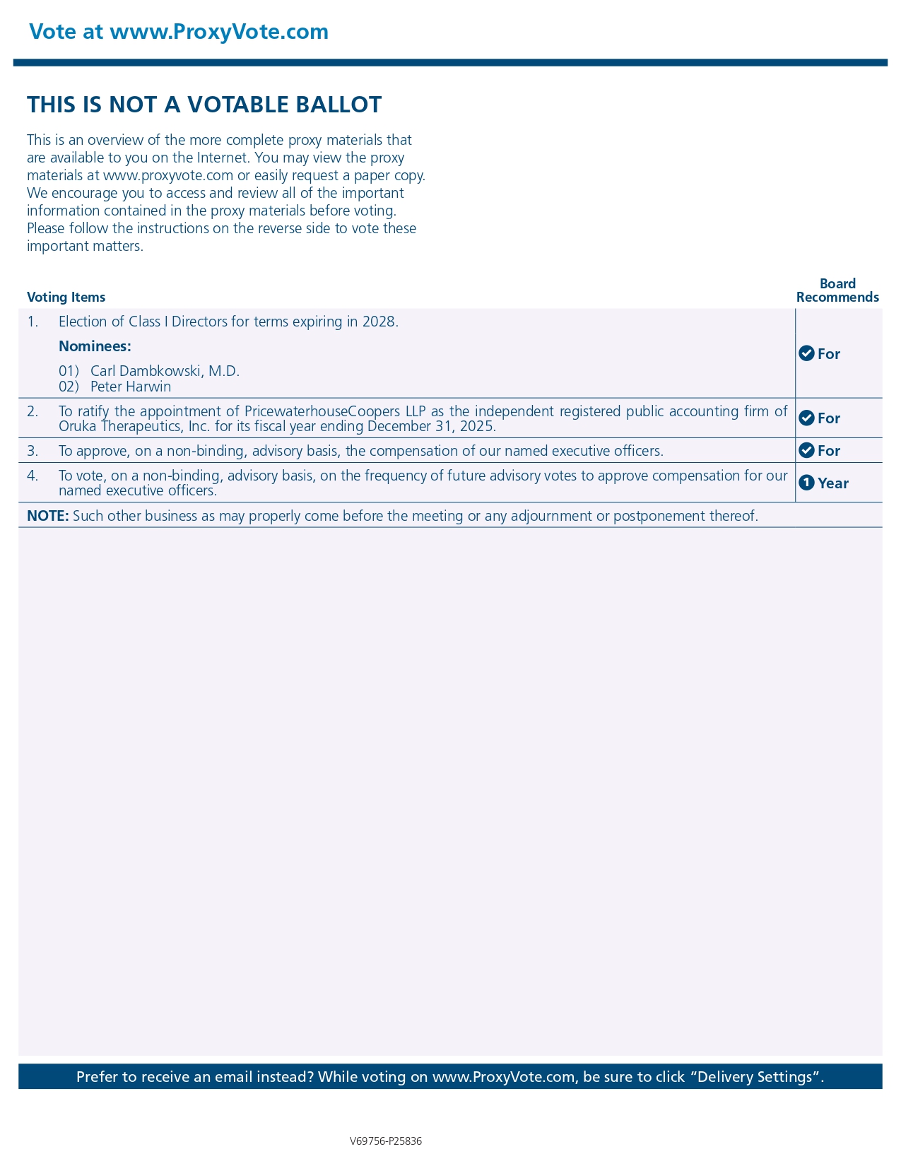 Vote at www.ProxyVote.com THIS IS NOT A VOTABLE BALLOT This is an overview of the more complete proxy materials that are available to you on the Internet. You may view the proxy materials at www.proxyvote.com or easily request a paper copy. We encourage you to access and review all of the important information contained in the proxy materials before voting. Please follow the instructions on the reverse side to vote these important matters. Prefer to receive an email instead? While voting on www.ProxyVote.com, be sure to click “Delivery Settings”. For 1. Election of Class I Directors for terms expiring in 2028. Nominees: 1) Carl Dambkowski, M.D. 2) Peter Harwin For 2. To ratify the appointment of PricewaterhouseCoopers LLP as the independent registered public accounting firm of Oruka Therapeutics, Inc. for its fiscal year ending December 31, 2025. For 3. To approve, on a non - binding, advisory basis, the compensation of our named executive officers. 1 Year 4. To vote, on a non - binding, advisory basis, on the frequency of future advisory votes to approve compensation for our named executive officers. NOTE: Such other business as may properly come before the meeting or any adjournment or postponement thereof. Voting Items Board Recommends V69756 - P25836