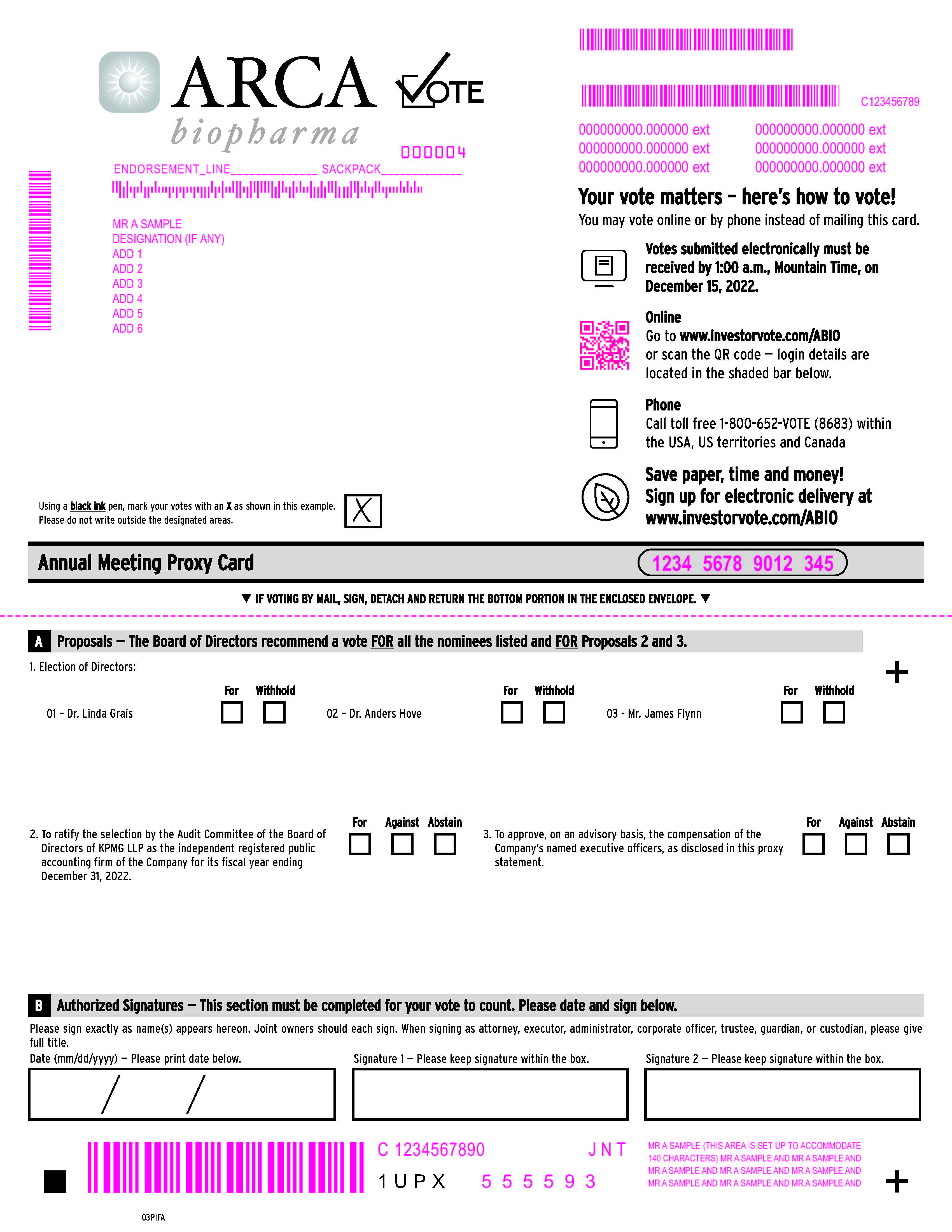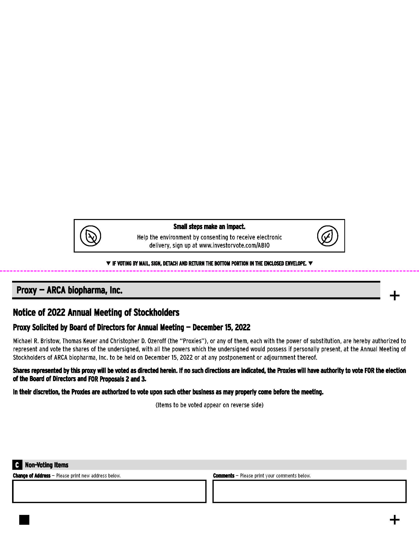 Small steps make an impact. Help the environment by consenting to receive electronic delivery, sign up at www.investorvote.com/ABIO • IF VOTING BY MAIL, SIGN, DETACH AND RETURN THE BOTTOM PORTION IN THE ENCLOSED ENVELOPE. • Proxy — ARCA biopharma, Inc. + Notice of 2022 Annual Meeting of Stockholders Proxy Solicited by Board of Directors for Annual Meeting — December 15, 2022 Michael R. Bristow, Thomas Keuer and Christopher D. Ozeroff (the “Proxies”), or any of them, each with the power of substitution, are hereby authorized to represent and vote the shares of the undersigned, with all the powers which the undersigned would possess if personally present, at the Annual Meeting of Stockholders of ARCA biopharma, Inc. to be held on December 15, 2022 or at any postponement or adjournment thereof. Shares represented by this proxy will be voted as directed herein. If no such directions are indicated, the Proxies will have authority to vote FOR the election of the Board of Directors and FOR Proposals 2 and 3. In their discretion, the Proxies are authorized to vote upon such other business as may properly come before the meeting.