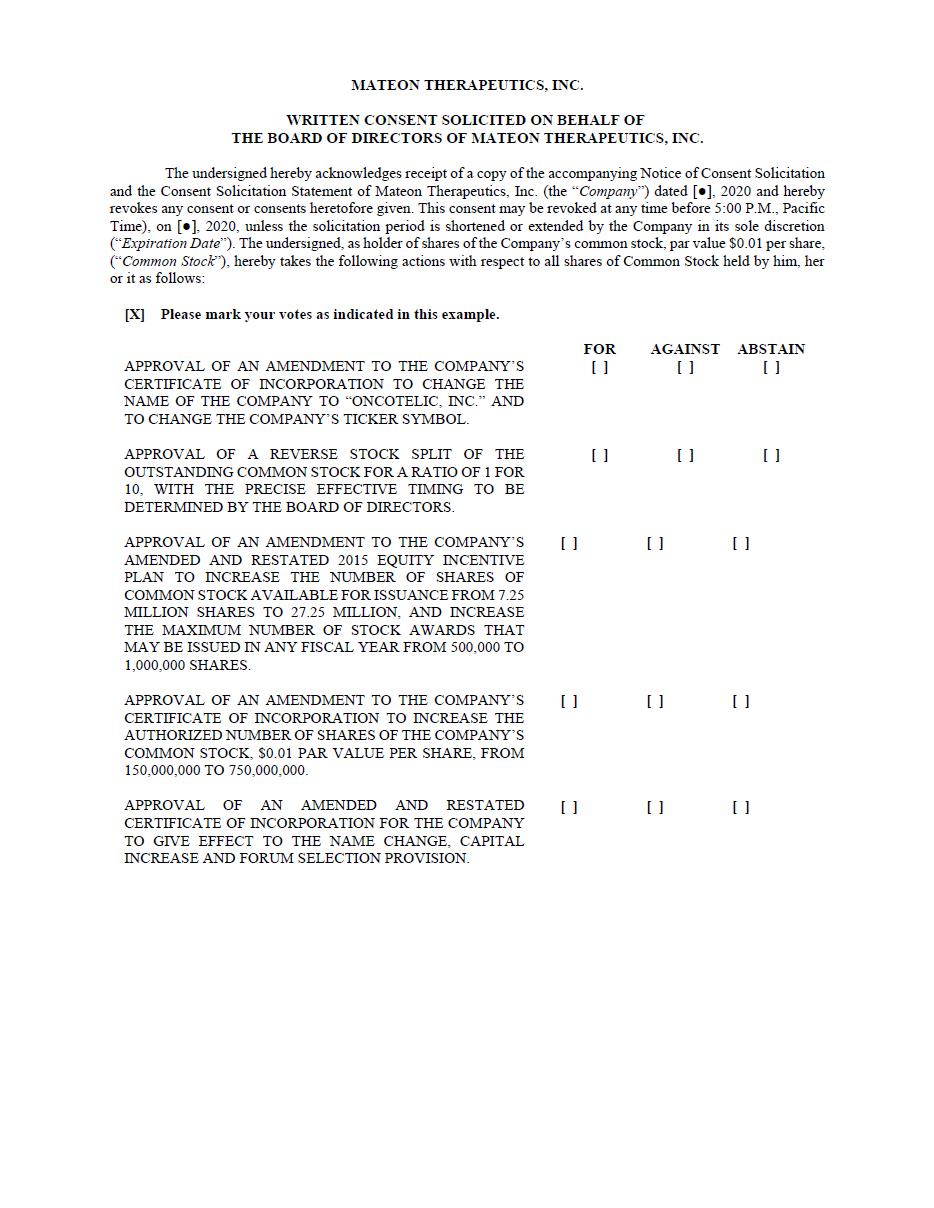 Mateon Therapeutics, Inc., a Delaware corporation (the “Company”), is soliciting your consent (the “Consent Solicitation”) and furnishing the accompanying Consent Solicitation Statement (the “Consent Solicitation Statement”) to the holders (“Stockholders”) of shares of its common stock, par value $0.01 per share (“Common Stock”) and Series A Convertible Preferred Stock, par value $0.01 per share (“Preferred Stock”) to approve the following actions (collectively, the “Corporate Actions”):