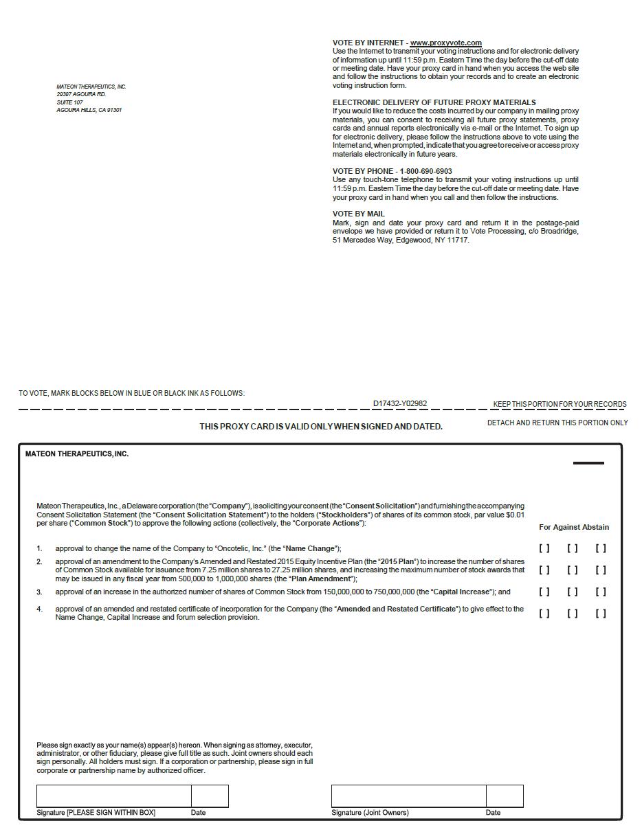 Mateon Therapeutics, Inc., a Delaware corporation (the “Company”), is soliciting your consent (the “Consent Solicitation”) and furnishing the accompanying Consent Solicitation Statement (the “Consent Solicitation Statement”) to the holders (“Stockholders”) of shares of its common stock, par value $0.01 per share (“Common Stock”) and Series A Convertible Preferred Stock, par value $0.01 per share (“Preferred Stock”) to approve the following actions (collectively, the “Corporate Actions”):