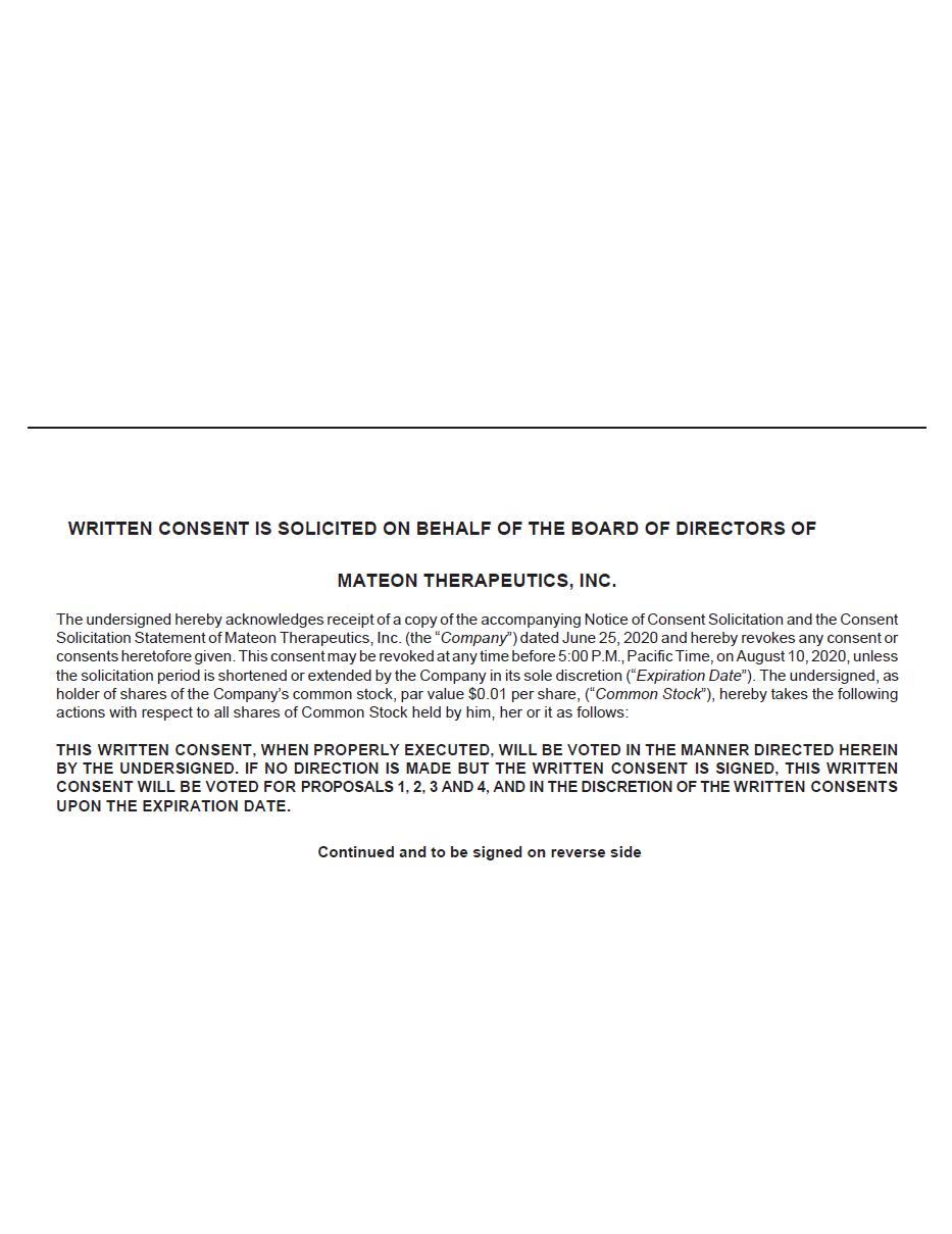 The undersigned hereby acknowledges receipt of a copy of the accompanying Notice of Consent Solicitation and the Consent Solicitation Statement of Mateon Therapeutics, Inc. (the “Company”) dated June 25, 2020 and hereby revokes any consent or consents heretofore given. This consent may be revoked at any time before 5:00 P.M., Pacific Time, on August 10, 2020, unless the solicitation period is shortened or extended by the Company in its sole discretion (“Expiration Date”). The undersigned, as holder of shares of the Company’s Series A Convertible Preferred Stock (“Preferred Stock”), hereby takes the following actions with respect to all shares of Preferred Stock held by him, her or it as follows: