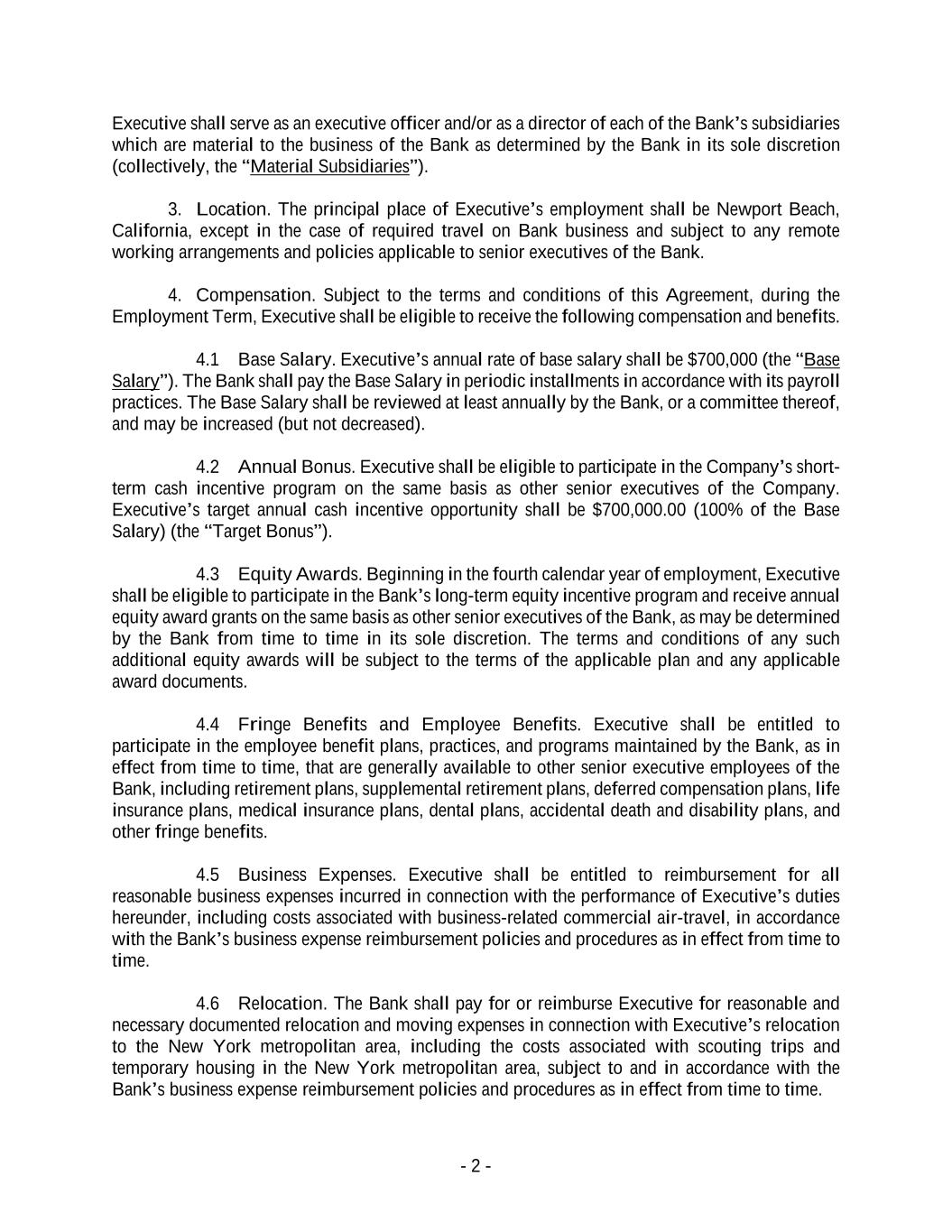- 2 - Executive shall serve as an executive officer and/or as a director of each of the Bank’s subsidiaries which are material to the business of the Bank as determined by the Bank in its sole discretion (collectively, the “Material Subsidiaries”). 3. Location. The principal place of Executive’s employment shall be Newport Beach, California, except in the case of required travel on Bank business and subject to any remote working arrangements and policies applicable to senior executives of the Bank. 4. Compensation. Subject to the terms and conditions of this Agreement, during the Employment Term, Executive shall be eligible to receive the following compensation and benefits. 4.1 Base Salary. Executive’s annual rate of base salary shall be $700,000 (the “Base Salary”). The Bank shall pay the Base Salary in periodic installments in accordance with its payroll practices. The Base Salary shall be reviewed at least annually by the Bank, or a committee thereof, and may be increased (but not decreased). 4.2 Annual Bonus. Executive shall be eligible to participate in the Company’s short- term cash incentive program on the same basis as other senior executives of the Company. Executive’s target annual cash incentive opportunity shall be $700,000.00 (100% of the Base Salary) (the “Target Bonus”). 4.3 Equity Awards. Beginning in the fourth calendar year of employment, Executive shall be eligible to participate in the Bank’s long-term equity incentive program and receive annual equity award grants on the same basis as other senior executives of the Bank, as may be determined by the Bank from time to time in its sole discretion. The terms and conditions of any such additional equity awards will be subject to the terms of the applicable plan and any applicable award documents. 4.4 Fringe Benefits and Employee Benefits. Executive shall be entitled to participate in the employee benefit plans, practices, and programs maintained by the Bank, as in effect from time to time, that are generally available to other senior executive employees of the Bank, including retirement plans, supplemental retirement plans, deferred compensation plans, life insurance plans, medical insurance plans, dental plans, accidental death and disability plans, and other fringe benefits. 4.5 Business Expenses. Executive shall be entitled to reimbursement for all reasonable business expenses incurred in connection with the performance of Executive’s duties hereunder, including costs associated with business-related commercial air-travel, in accordance with the Bank’s business expense reimbursement policies and procedures as in effect from time to time. 4.6 Relocation. The Bank shall pay for or reimburse Executive for reasonable and necessary documented relocation and moving expenses in connection with Executive’s relocation to the New York metropolitan area, including the costs associated with scouting trips and temporary housing in the New York metropolitan area, subject to and in accordance with the Bank’s business expense reimbursement policies and procedures as in effect from time to time.