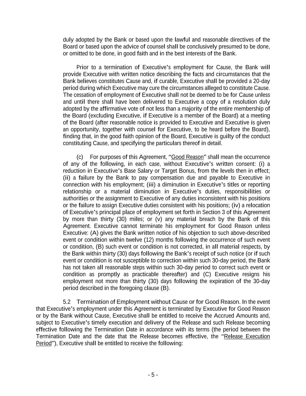 - 5 - duly adopted by the Bank or based upon the lawful and reasonable directives of the Board or based upon the advice of counsel shall be conclusively presumed to be done, or omitted to be done, in good faith and in the best interests of the Bank. Prior to a termination of Executive’s employment for Cause, the Bank will provide Executive with written notice describing the facts and circumstances that the Bank believes constitutes Cause and, if curable, Executive shall be provided a 20-day period during which Executive may cure the circumstances alleged to constitute Cause. The cessation of employment of Executive shall not be deemed to be for Cause unless and until there shall have been delivered to Executive a copy of a resolution duly adopted by the affirmative vote of not less than a majority of the entire membership of the Board (excluding Executive, if Executive is a member of the Board) at a meeting of the Board (after reasonable notice is provided to Executive and Executive is given an opportunity, together with counsel for Executive, to be heard before the Board), finding that, in the good faith opinion of the Board, Executive is guilty of the conduct constituting Cause, and specifying the particulars thereof in detail. (c) For purposes of this Agreement, “Good Reason” shall mean the occurrence of any of the following, in each case, without Executive’s written consent: (i) a reduction in Executive’s Base Salary or Target Bonus, from the levels then in effect; (ii) a failure by the Bank to pay compensation due and payable to Executive in connection with his employment; (iii) a diminution in Executive’s titles or reporting relationship or a material diminution in Executive’s duties, responsibilities or authorities or the assignment to Executive of any duties inconsistent with his positions or the failure to assign Executive duties consistent with his positions; (iv) a relocation of Executive’s principal place of employment set forth in Section 3 of this Agreement by more than thirty (30) miles; or (v) any material breach by the Bank of this Agreement. Executive cannot terminate his employment for Good Reason unless Executive: (A) gives the Bank written notice of his objection to such above-described event or condition within twelve (12) months following the occurrence of such event or condition, (B) such event or condition is not corrected, in all material respects, by the Bank within thirty (30) days following the Bank’s receipt of such notice (or if such event or condition is not susceptible to correction within such 30-day period, the Bank has not taken all reasonable steps within such 30-day period to correct such event or condition as promptly as practicable thereafter) and (C) Executive resigns his employment not more than thirty (30) days following the expiration of the 30-day period described in the foregoing clause (B). 5.2 Termination of Employment without Cause or for Good Reason. In the event that Executive’s employment under this Agreement is terminated by Executive for Good Reason or by the Bank without Cause, Executive shall be entitled to receive the Accrued Amounts and, subject to Executive’s timely execution and delivery of the Release and such Release becoming effective following the Termination Date in accordance with its terms (the period between the Termination Date and the date that the Release becomes effective, the “Release Execution Period”), Executive shall be entitled to receive the following: