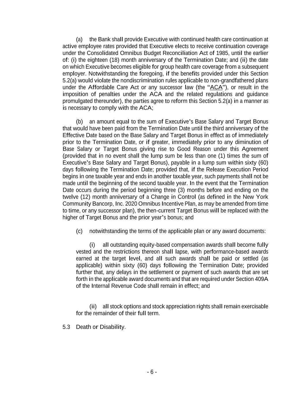 - 6 - (a) the Bank shall provide Executive with continued health care continuation at active employee rates provided that Executive elects to receive continuation coverage under the Consolidated Omnibus Budget Reconciliation Act of 1985, until the earlier of: (i) the eighteen (18) month anniversary of the Termination Date; and (ii) the date on which Executive becomes eligible for group health care coverage from a subsequent employer. Notwithstanding the foregoing, if the benefits provided under this Section 5.2(a) would violate the nondiscrimination rules applicable to non-grandfathered plans under the Affordable Care Act or any successor law (the “ACA”), or result in the imposition of penalties under the ACA and the related regulations and guidance promulgated thereunder), the parties agree to reform this Section 5.2(a) in a manner as is necessary to comply with the ACA; (b) an amount equal to the sum of Executive’s Base Salary and Target Bonus that would have been paid from the Termination Date until the third anniversary of the Effective Date based on the Base Salary and Target Bonus in effect as of immediately prior to the Termination Date, or if greater, immediately prior to any diminution of Base Salary or Target Bonus giving rise to Good Reason under this Agreement (provided that in no event shall the lump sum be less than one (1) times the sum of Executive’s Base Salary and Target Bonus), payable in a lump sum within sixty (60) days following the Termination Date; provided that, if the Release Execution Period begins in one taxable year and ends in another taxable year, such payments shall not be made until the beginning of the second taxable year. In the event that the Termination Date occurs during the period beginning three (3) months before and ending on the twelve (12) month anniversary of a Change in Control (as defined in the New York Community Bancorp, Inc. 2020 Omnibus Incentive Plan, as may be amended from time to time, or any successor plan), the then-current Target Bonus will be replaced with the higher of Target Bonus and the prior year’s bonus; and (c) notwithstanding the terms of the applicable plan or any award documents: (i) all outstanding equity-based compensation awards shall become fully vested and the restrictions thereon shall lapse, with performance-based awards earned at the target level, and all such awards shall be paid or settled (as applicable) within sixty (60) days following the Termination Date; provided further that, any delays in the settlement or payment of such awards that are set forth in the applicable award documents and that are required under Section 409A of the Internal Revenue Code shall remain in effect; and (ii) all stock options and stock appreciation rights shall remain exercisable for the remainder of their full term. 5.3 Death or Disability.