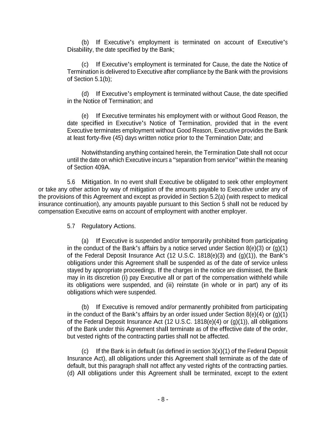 - 8 - (b) If Executive’s employment is terminated on account of Executive’s Disability, the date specified by the Bank; (c) If Executive’s employment is terminated for Cause, the date the Notice of Termination is delivered to Executive after compliance by the Bank with the provisions of Section 5.1(b); (d) If Executive’s employment is terminated without Cause, the date specified in the Notice of Termination; and (e) If Executive terminates his employment with or without Good Reason, the date specified in Executive’s Notice of Termination, provided that in the event Executive terminates employment without Good Reason, Executive provides the Bank at least forty-five (45) days written notice prior to the Termination Date; and Notwithstanding anything contained herein, the Termination Date shall not occur until the date on which Executive incurs a “separation from service” within the meaning of Section 409A. 5.6 Mitigation. In no event shall Executive be obligated to seek other employment or take any other action by way of mitigation of the amounts payable to Executive under any of the provisions of this Agreement and except as provided in Section 5.2(a) (with respect to medical insurance continuation), any amounts payable pursuant to this Section 5 shall not be reduced by compensation Executive earns on account of employment with another employer. 5.7 Regulatory Actions. (a) If Executive is suspended and/or temporarily prohibited from participating in the conduct of the Bank’s affairs by a notice served under Section 8(e)(3) or (g)(1) of the Federal Deposit Insurance Act (12 U.S.C. 1818(e)(3) and (g)(1)), the Bank’s obligations under this Agreement shall be suspended as of the date of service unless stayed by appropriate proceedings. If the charges in the notice are dismissed, the Bank may in its discretion (i) pay Executive all or part of the compensation withheld while its obligations were suspended, and (ii) reinstate (in whole or in part) any of its obligations which were suspended. (b) If Executive is removed and/or permanently prohibited from participating in the conduct of the Bank’s affairs by an order issued under Section 8(e)(4) or (g)(1) of the Federal Deposit Insurance Act (12 U.S.C. 1818(e)(4) or (g)(1)), all obligations of the Bank under this Agreement shall terminate as of the effective date of the order, but vested rights of the contracting parties shall not be affected. (c) If the Bank is in default (as defined in section 3(x)(1) of the Federal Deposit Insurance Act), all obligations under this Agreement shall terminate as of the date of default, but this paragraph shall not affect any vested rights of the contracting parties. (d) All obligations under this Agreement shall be terminated, except to the extent