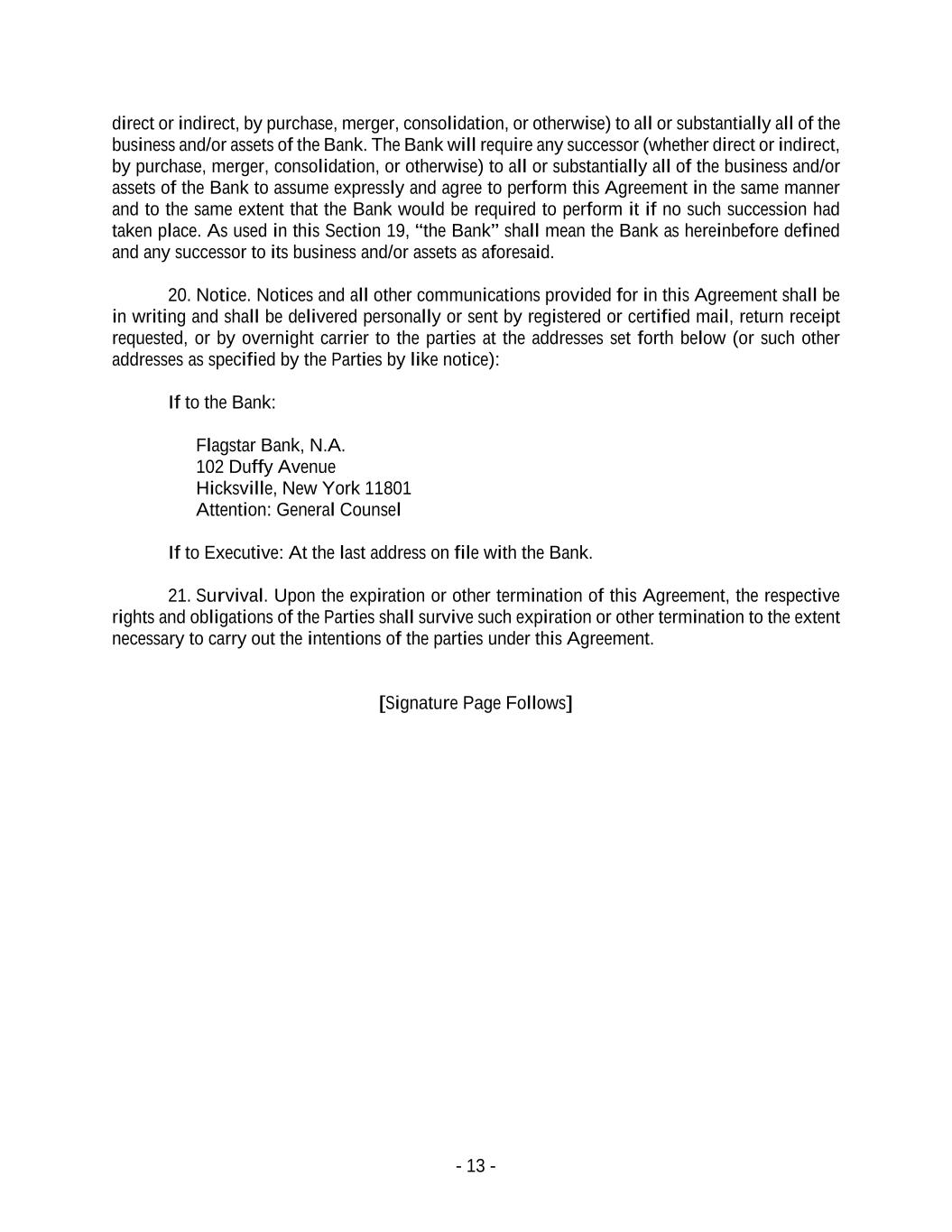 - 13 - direct or indirect, by purchase, merger, consolidation, or otherwise) to all or substantially all of the business and/or assets of the Bank. The Bank will require any successor (whether direct or indirect, by purchase, merger, consolidation, or otherwise) to all or substantially all of the business and/or assets of the Bank to assume expressly and agree to perform this Agreement in the same manner and to the same extent that the Bank would be required to perform it if no such succession had taken place. As used in this Section 19, “the Bank” shall mean the Bank as hereinbefore defined and any successor to its business and/or assets as aforesaid. 20. Notice. Notices and all other communications provided for in this Agreement shall be in writing and shall be delivered personally or sent by registered or certified mail, return receipt requested, or by overnight carrier to the parties at the addresses set forth below (or such other addresses as specified by the Parties by like notice): If to the Bank: Flagstar Bank, N.A. 102 Duffy Avenue Hicksville, New York 11801 Attention: General Counsel If to Executive: At the last address on file with the Bank. 21. Survival. Upon the expiration or other termination of this Agreement, the respective rights and obligations of the Parties shall survive such expiration or other termination to the extent necessary to carry out the intentions of the parties under this Agreement. [Signature Page Follows]