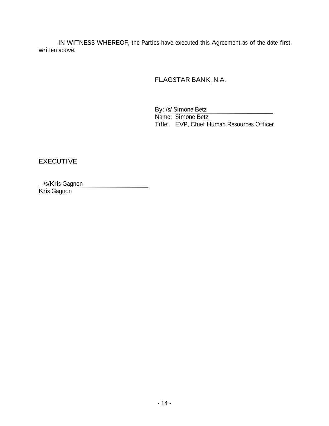 - 14 - IN WITNESS WHEREOF, the Parties have executed this Agreement as of the date first written above. FLAGSTAR BANK, N.A. By: /s/ Simone Betz Name: Simone Betz Title: EVP, Chief Human Resources Officer EXECUTIVE /s/Kris Gagnon Kris Gagnon
