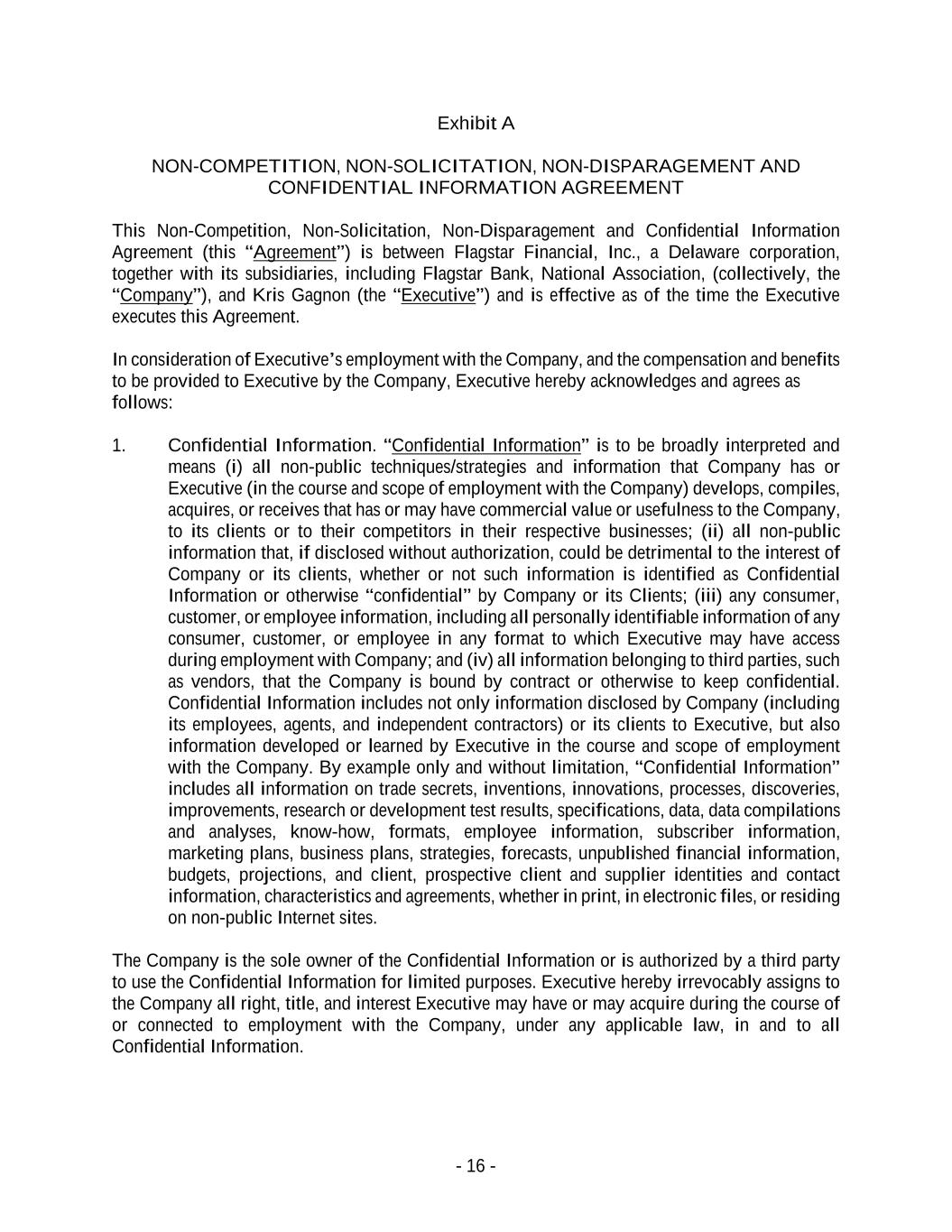 - 16 - Exhibit A NON-COMPETITION, NON-SOLICITATION, NON-DISPARAGEMENT AND CONFIDENTIAL INFORMATION AGREEMENT This Non-Competition, Non-Solicitation, Non-Disparagement and Confidential Information Agreement (this “Agreement”) is between Flagstar Financial, Inc., a Delaware corporation, together with its subsidiaries, including Flagstar Bank, National Association, (collectively, the “Company”), and Kris Gagnon (the “Executive”) and is effective as of the time the Executive executes this Agreement. In consideration of Executive’s employment with the Company, and the compensation and benefits to be provided to Executive by the Company, Executive hereby acknowledges and agrees as follows: 1. Confidential Information. “Confidential Information” is to be broadly interpreted and means (i) all non-public techniques/strategies and information that Company has or Executive (in the course and scope of employment with the Company) develops, compiles, acquires, or receives that has or may have commercial value or usefulness to the Company, to its clients or to their competitors in their respective businesses; (ii) all non-public information that, if disclosed without authorization, could be detrimental to the interest of Company or its clients, whether or not such information is identified as Confidential Information or otherwise “confidential” by Company or its Clients; (iii) any consumer, customer, or employee information, including all personally identifiable information of any consumer, customer, or employee in any format to which Executive may have access during employment with Company; and (iv) all information belonging to third parties, such as vendors, that the Company is bound by contract or otherwise to keep confidential. Confidential Information includes not only information disclosed by Company (including its employees, agents, and independent contractors) or its clients to Executive, but also information developed or learned by Executive in the course and scope of employment with the Company. By example only and without limitation, “Confidential Information” includes all information on trade secrets, inventions, innovations, processes, discoveries, improvements, research or development test results, specifications, data, data compilations and analyses, know-how, formats, employee information, subscriber information, marketing plans, business plans, strategies, forecasts, unpublished financial information, budgets, projections, and client, prospective client and supplier identities and contact information, characteristics and agreements, whether in print, in electronic files, or residing on non-public Internet sites. The Company is the sole owner of the Confidential Information or is authorized by a third party to use the Confidential Information for limited purposes. Executive hereby irrevocably assigns to the Company all right, title, and interest Executive may have or may acquire during the course of or connected to employment with the Company, under any applicable law, in and to all Confidential Information.