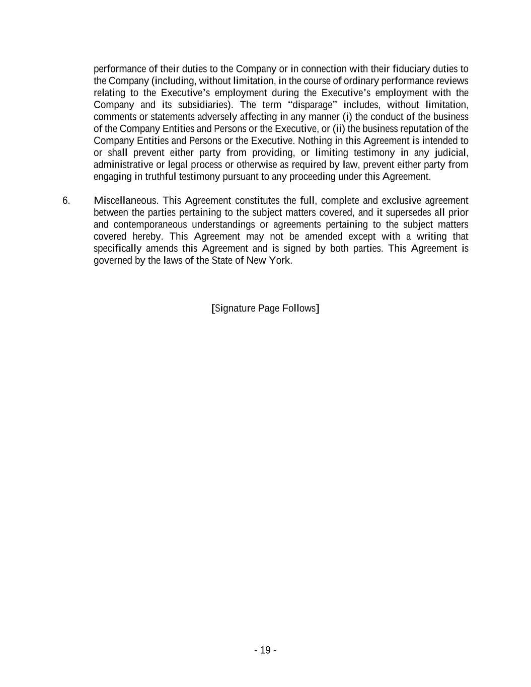 - 19 - performance of their duties to the Company or in connection with their fiduciary duties to the Company (including, without limitation, in the course of ordinary performance reviews relating to the Executive’s employment during the Executive’s employment with the Company and its subsidiaries). The term “disparage” includes, without limitation, comments or statements adversely affecting in any manner (i) the conduct of the business of the Company Entities and Persons or the Executive, or (ii) the business reputation of the Company Entities and Persons or the Executive. Nothing in this Agreement is intended to or shall prevent either party from providing, or limiting testimony in any judicial, administrative or legal process or otherwise as required by law, prevent either party from engaging in truthful testimony pursuant to any proceeding under this Agreement. 6. Miscellaneous. This Agreement constitutes the full, complete and exclusive agreement between the parties pertaining to the subject matters covered, and it supersedes all prior and contemporaneous understandings or agreements pertaining to the subject matters covered hereby. This Agreement may not be amended except with a writing that specifically amends this Agreement and is signed by both parties. This Agreement is governed by the laws of the State of New York. [Signature Page Follows]